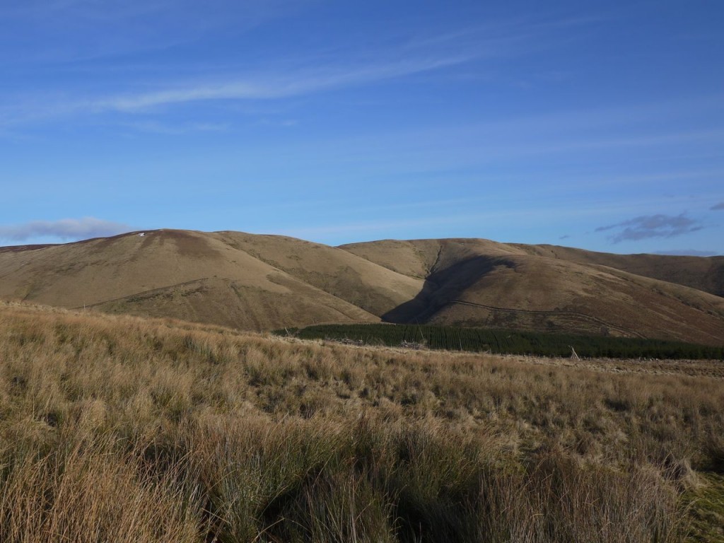 Tudhope Hill (which locals pronounce without vowels, T’d’h’p) has a trig pillar and appears to be the highest point of this walk, though it is 20m lower than Cauldcleuch Head. The descent from Tudhope Hill was a bit of strain on ageing knees but the ground eventually became firmer. I began to wonder if this walk might not have the usual terrain set-up of these southern hills: wet undergrowth that thoroughly cleans footwear surrounded by a ring of muddy ground to re-encrust them just before the end.