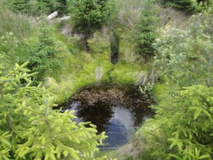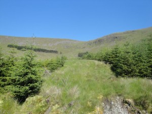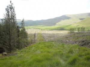 The path led down by newly planted forest until it petered out amongst newly felled forest. This is difficult terrain. There are deep water filled ditches hidden beneath dead branches. Jumping quickly through this is asking for a broken ankle, so it has to be taken slowly. After a few minutes I was on the remains of a fire break. This looked easier but was more boggy, littered with rocks, some of which rocked, and the remains of felled trees.
