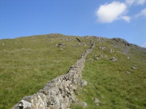 After a fence the gradient increased and I tried to use the rocks as a staircase where I could, since steps from rock do seem more efficient than those from grass. In places the ground was uncomfortably steep but I made sure I didn’t look down unless I was on what might be termed a ledge. What I did learn was that not all rocks are firmly attached to the hill.