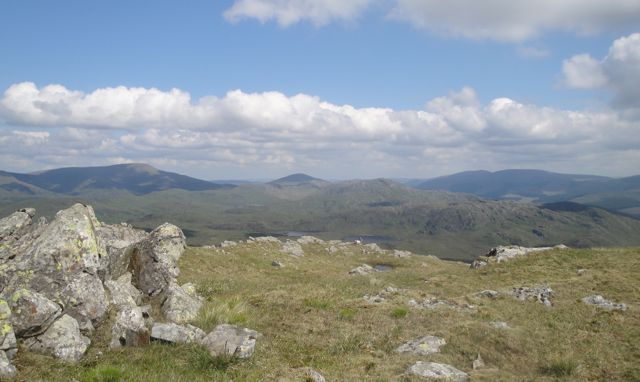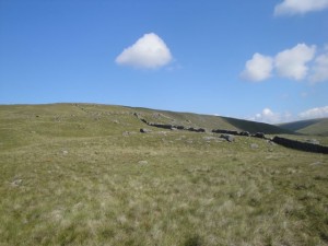 I eventually spotted a wall and thought I was near the top. I decided to take a breather leaning on the wall. From there I had a view of Curleywee beyond Bennanbrack, Millfore, Cairnsmore of Fleet and Wigton Bay. The wall disappeared over the horizon just a hundred metres away, but once I crested that hill I could see that the summit was still 500m away. By now however I was on the whaleback of Larg Hill and the ground was short close-cropped grass without wet patches. The sun was beating down and I regretted forgetting my sun-hat.