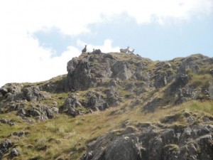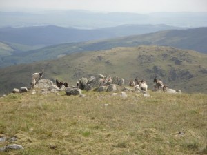 I decided to go for the direct approach and headed for the slope closest to me. There were half a dozen goats making their way up a scree slope without dislodging a single stone so I wondered about the scree. After a closer look I decided to stick to grass. Here I saw the first sign of another human being (other than the fence posts), a footprint. So someone else had been this way. Up I went picking my way up the slope, finding footholds, occasionally contouring on a goat track to a more amenable section and scrambling over rocks close to the summit. The goats watched from on high as before, then disappeared from sight.