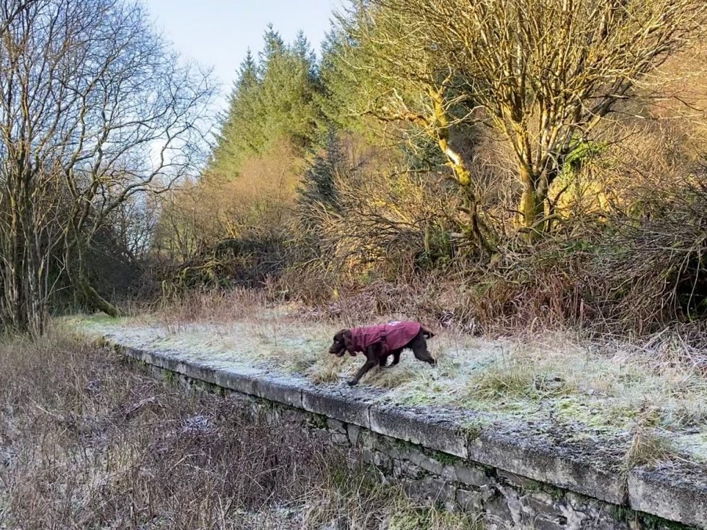 Good to be out and about. We had clear skies but it was bitterly cold. On a warmer day I might have walked up to the Rosnes Bench or continued along the road once we ran out of walkable railway track. As it was we walked along to Gatehouse Station (six miles north of Gatehouse of Fleet!) and moseyed back. (It was too cold for the dogs to stay out very long).