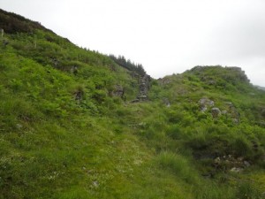 Heading down by the fence there appeared to be a path. This became increasingly wet and eventually became a stream. A little further down the ferns were back but there did seem to be track through them which contoured around the hill into the valley of the Russon burn.
