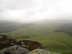 No paths. Deep wet undergrowth and occasional bogs but the going was not especially tough. Looking ahead I was surprised how high the Clints were. I took several diversions to the edge to see the views and these were quite tiring. By the time I reached the Deep Nick of Dromore the rain had increased to heavy and horizontal with mist. A song kept playing in my mind with the words ‘horizontal rain’ but the lyrics didn’t seem right. Eventually I remembered it should have been purple rain.