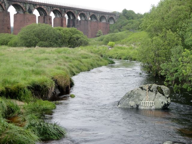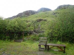 I parked at the car park just under the Big Water of Fleet viaduct, where there is a picnic area and an unusual wooden seat surrounded by a dry stone wall. I walked over to take a photo, and as I walked the rain began again. It was only light rain, though, not enough to warrant waterproofs, yet.