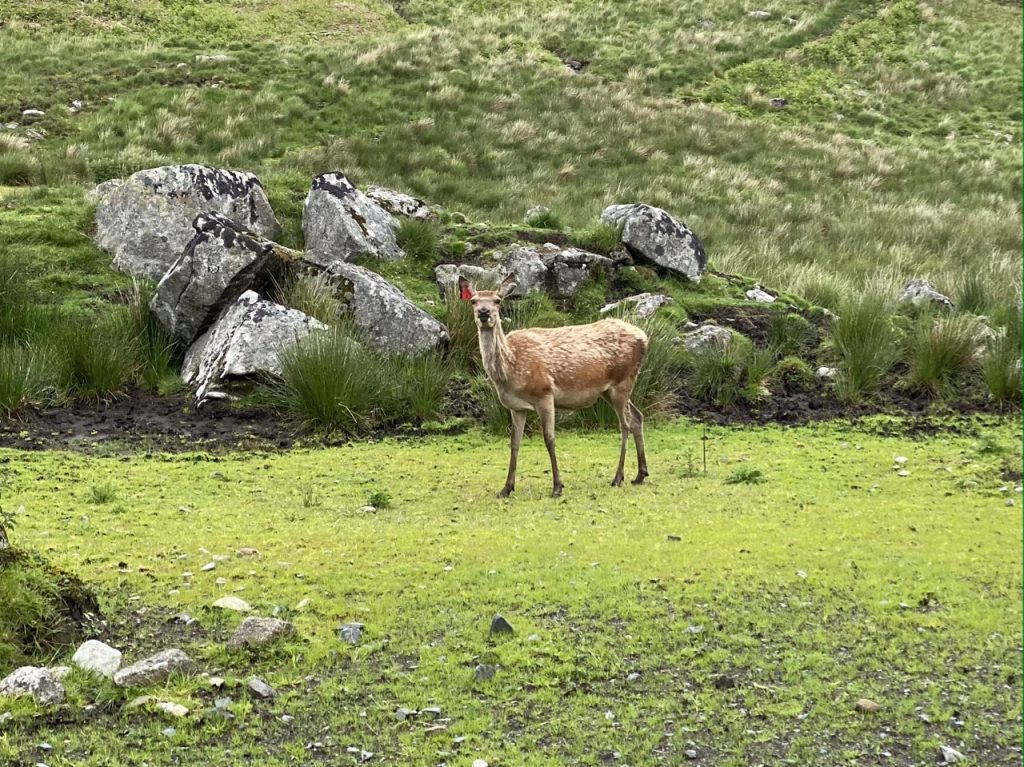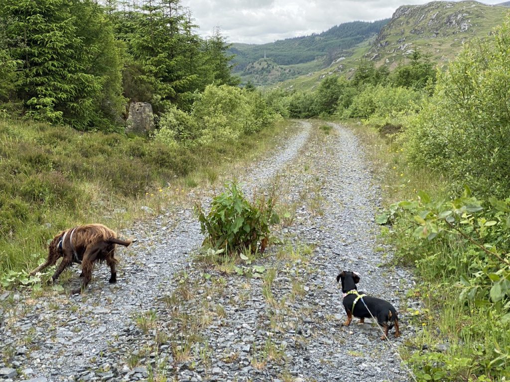 I hadn’t realised there was a footpath from Brockloch Bridge. Having spotted it we felt obliged to explore. It goes up to the Galloway Red Deer range (which actually has its own car park). There is a hide and a wooden fence with spy-holes at various heights (presumably to accommodate adults and children). The deer seemed unaware that we were so close. And the dogs seemed unaware of the deer – I’ll have to send them on a hound refresher course.