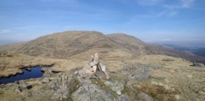 Kirriereoch eventually flattened out. At first I thought I could see the top of a cottage on the summit. It seemed strange that such a large structure would be built up here and that I had not heard of it. It was in fact a shelter but my mind was playing tricks regarding size and distance perception. Similar problems occurred in finding the actual summit. The shelter was clearly not the highest point and I was not convinced that either of two cairns were either. I spent some time walking to what looked to be the summit then spying somewhere that looked higher. During this wandering I often had the experience of walking towards a place that looked higher but with my other senses telling me I was walking downwards. I presume this is something akin to the gravity hill illusion which occurs when the true horizon cannot be seen.