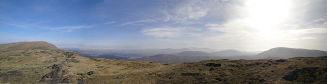 There are the buildings at Slaethornrig and Tunskeen, the alternate start to these hills. Beyond them the lochs Riecawr and Macaterick. The Dungeon Hills, Loch Enoch, Merrick, Mullwharchar, and the Rhinns of Kells made up the rest of the panorama.