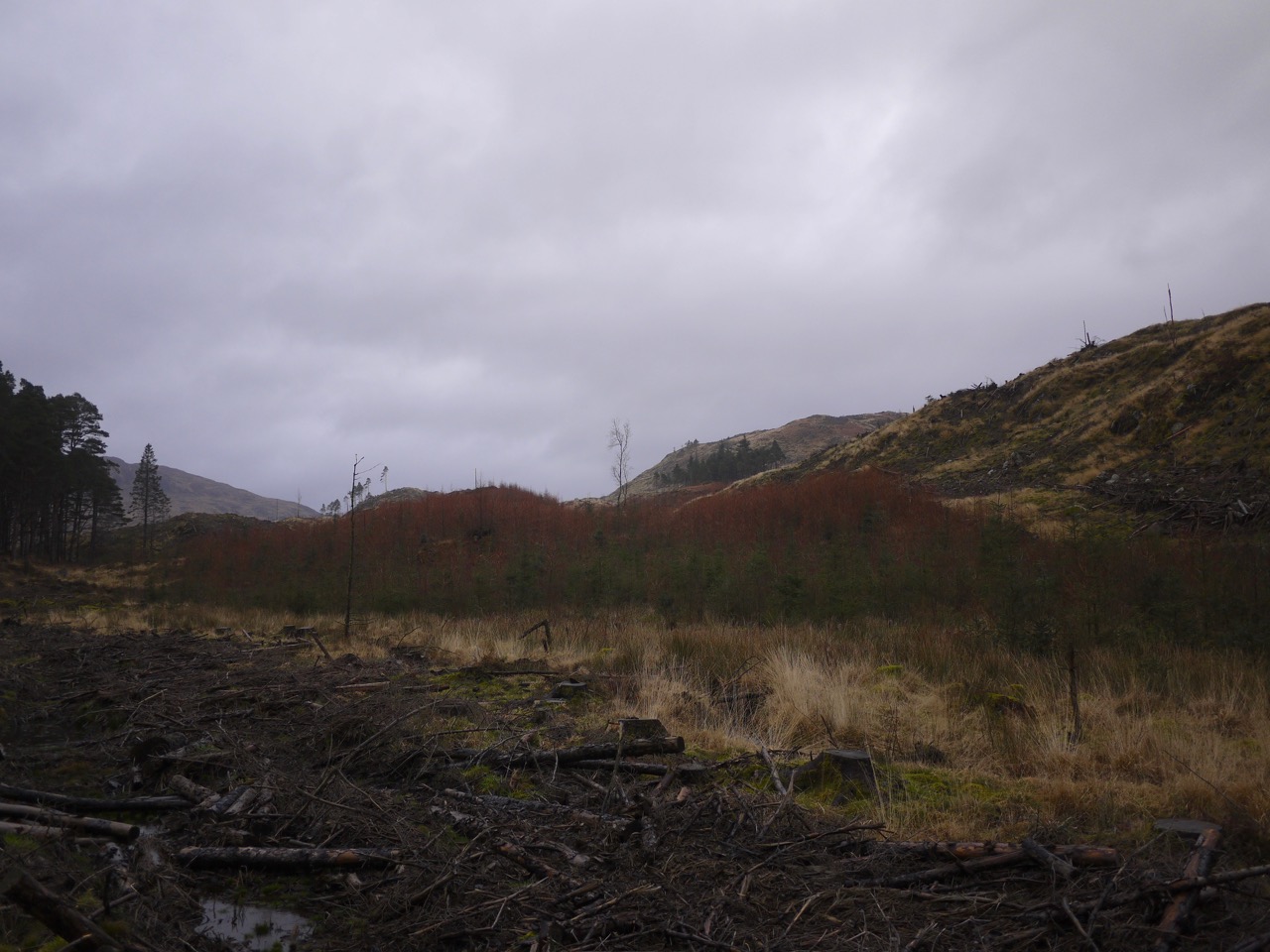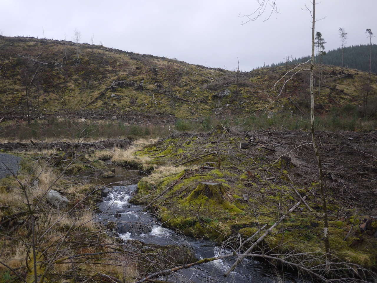 The slopes beside the loch’s southern bank are now open, the trees gone, leaving the usual mess of broken branches and tree stumps. I think the experience of walking in a more open setting is quite different from walking in a forest. Even though one can glimpse more distant features through the trees when walking in forest, I find myself looking at closer features, the moss on tree trunks and the path itself, whereas with the trees gone, my eyes are drawn to the hill-side slopes and the hills.
