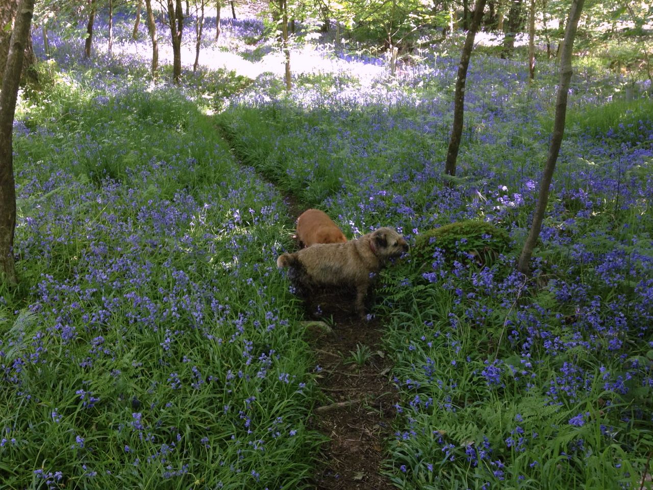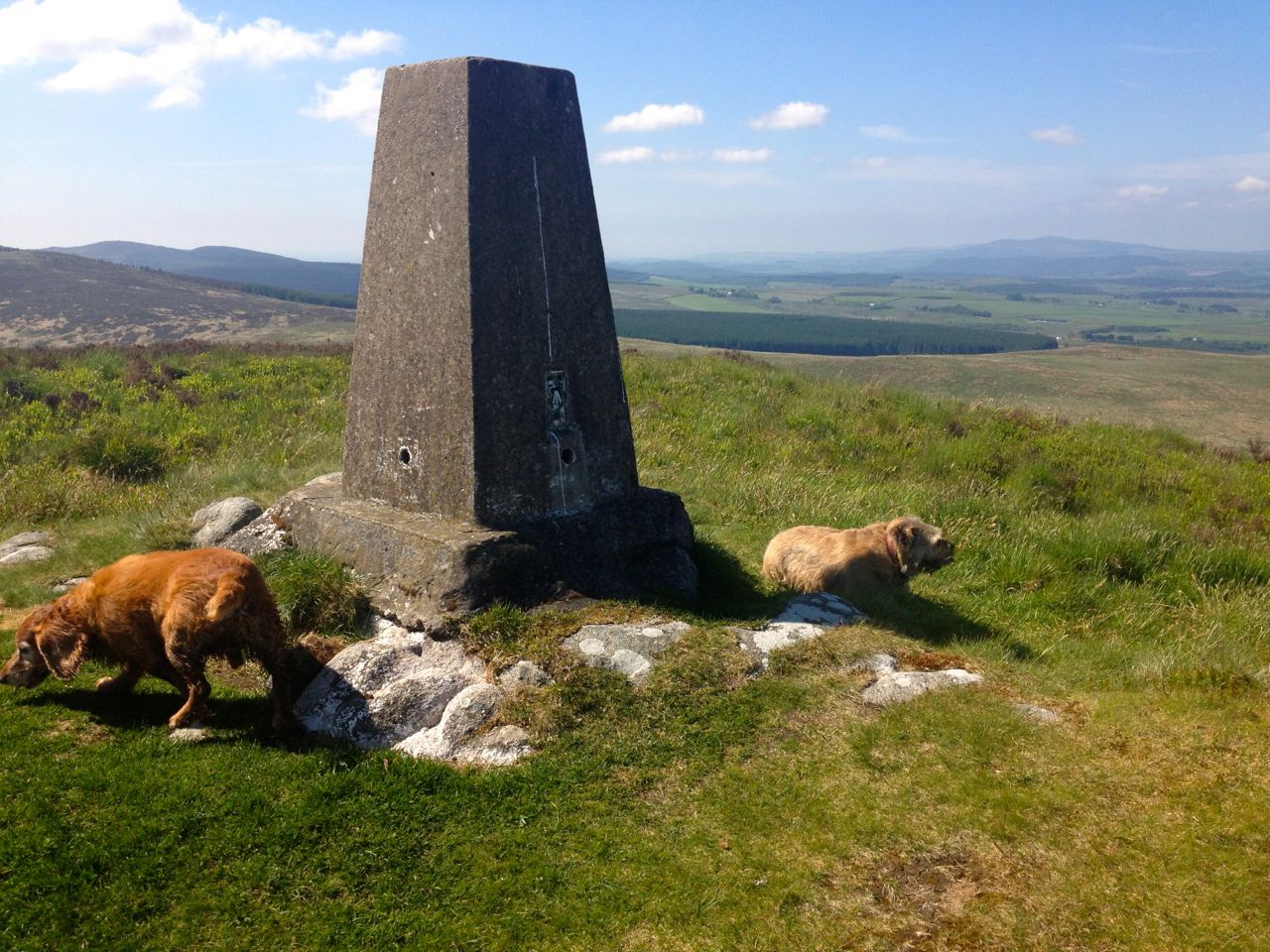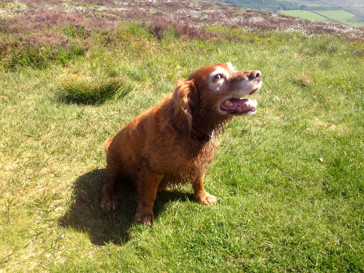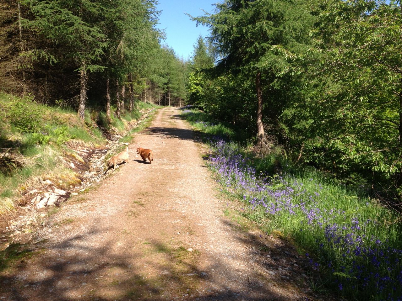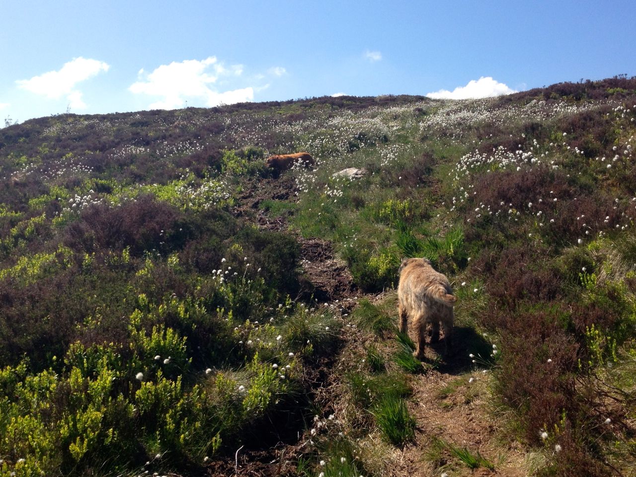 The forestry track ends near a small quarry where I found a piece of sandstone with quartz crystals covering one side. The path then narrows and winds up through the trees. This is usually quite boggy but with the warm sunny weather it was just a little boggy (the dogs sinking to mid-leg level).