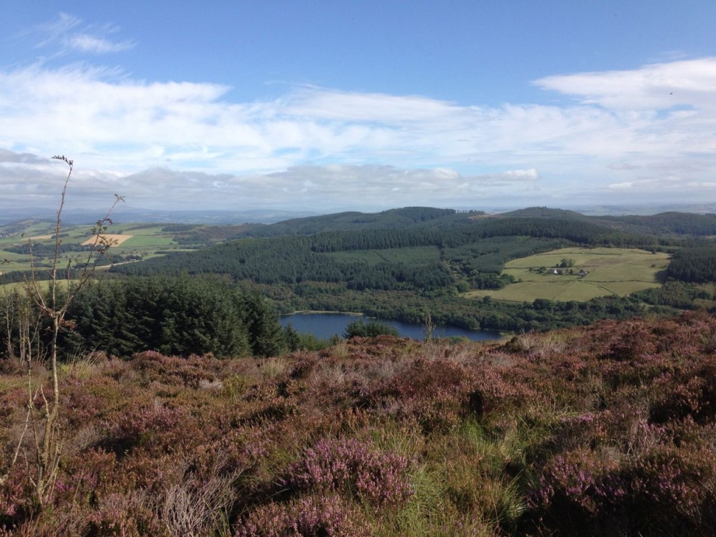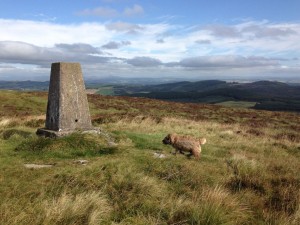 I had set off from home intending to walk the dogs along the forestry track at Kissock, but Lotus Hill was too tempting. About half a mile from the car park the forestry track divides and I turned right up a gentle slope. The first mile is on firm tracks but then degenerates into a boggy path that climbs to the bog that covers most of the summit.