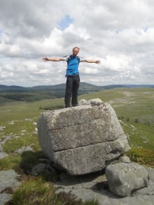 The climb up Hoodens ridge is full of false summits to sap the morale of the unwary but as we climbed the views improved. Certainly by the time we were at Gordon’s Loup at just above 400m we could see the cliffs of the Wolf Slock (the pictures don’t do them justice), the Rhinns of Kells, the Awfu’ hand, and the lochs Doon, Macaterick and Riecawr. There were scattered erratics balancing on smaller rocks allowing some candid photos.