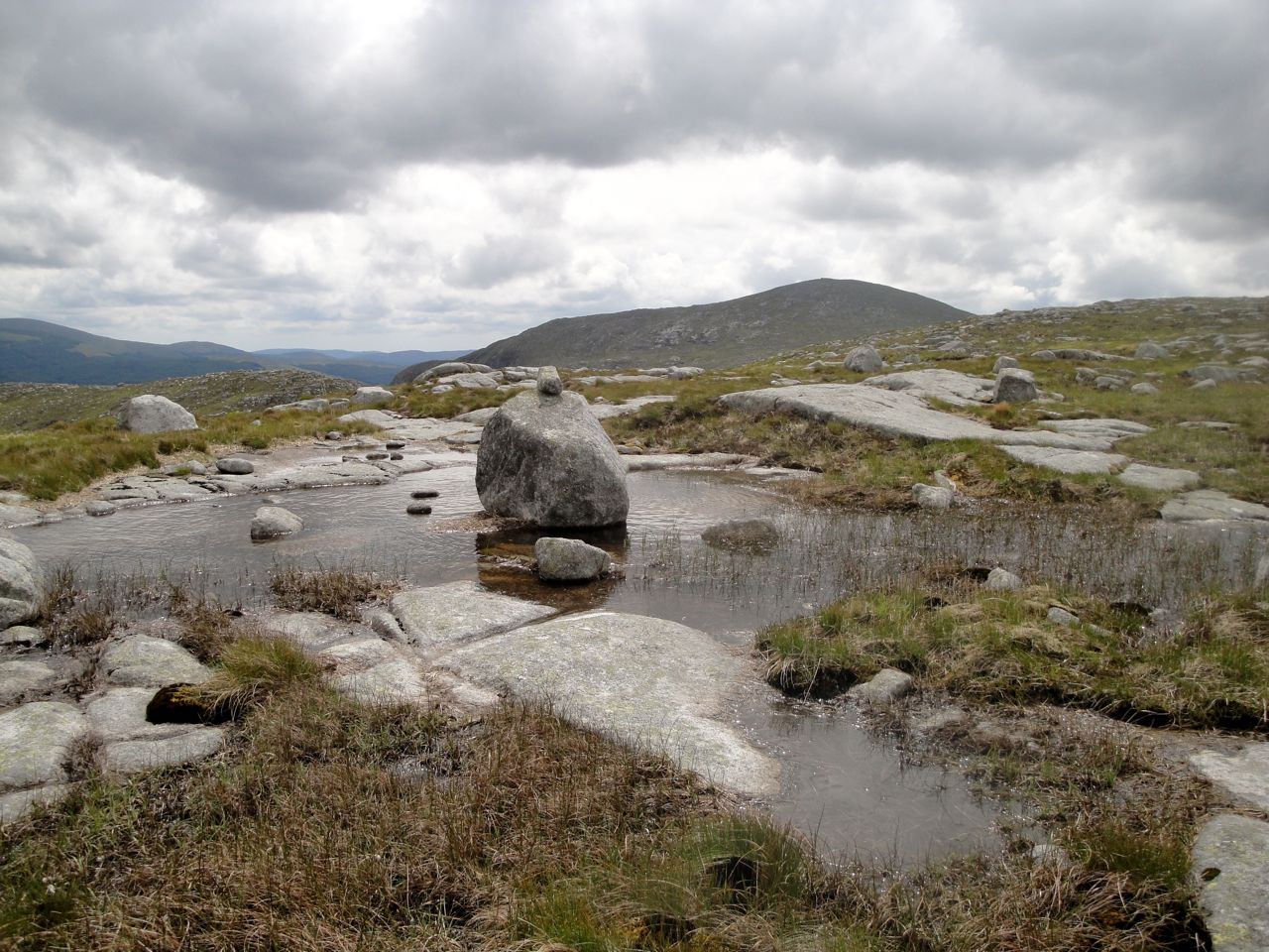 Hoodens Hill has several prominences all of which have cairns of one size or another. We had some photos with the largest cairn but I suspect it was not the highest. There were several lochans up here, one with an erratic poised artfully in its centre.