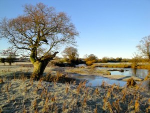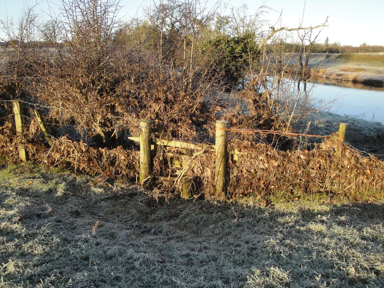 Rather than continue along the track directly to Nunholm, I took a left through a concrete ginnel under the railway. This had a pool of frozen slurry filling it. Did I say frozen? Not once I was in the middle of it when the surface gave way. Luckily it was only a couple of inches deep but enough to coat my boots. To cap it all the outside tap was frozen when I got home as well. From here it was across open pasture with huge flocks of geese circling above me until I fought my way through fence and hedgerow to get onto and across the A75 near the A701 junction. The road was busier now and the crossing took some time. I suspect it would have been possible to pass under the bridge on the river bank which would have been easier and safer. The reason for this detour was so I could walk along the riverside levee that I have seen so often when driving along the ring road. Well I’ve done it now and that’s all I can say about it. If I did this route again I would either miss this section out or cross the Nith on the pavement of the road bridge and walk along the other bank, which has a path.