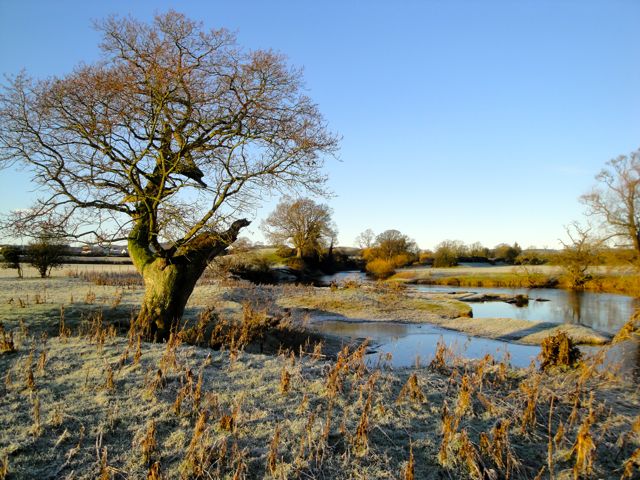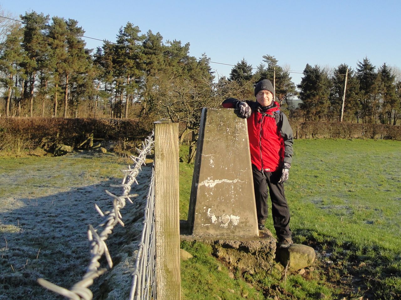 A little past Holywood church is a trig Pillar in a field of docile sheep. I had not seen one in open countryside before. It stands at the impressive elevation of 27m and is the lowest in the county, if you ignore those on the coast. This was the half way point. I then headed south along a single track road trying to place my feet where the sun had melted the ice and squinting into the sun. I was now walking in the tongue of land lying between the waters of the Nith and the Cluden, towards the site of the old Martinton ford. Since all was flat around me there were good views of Criffel to the south, See Morris Hill and friends, and the hills beyond Amisfield.