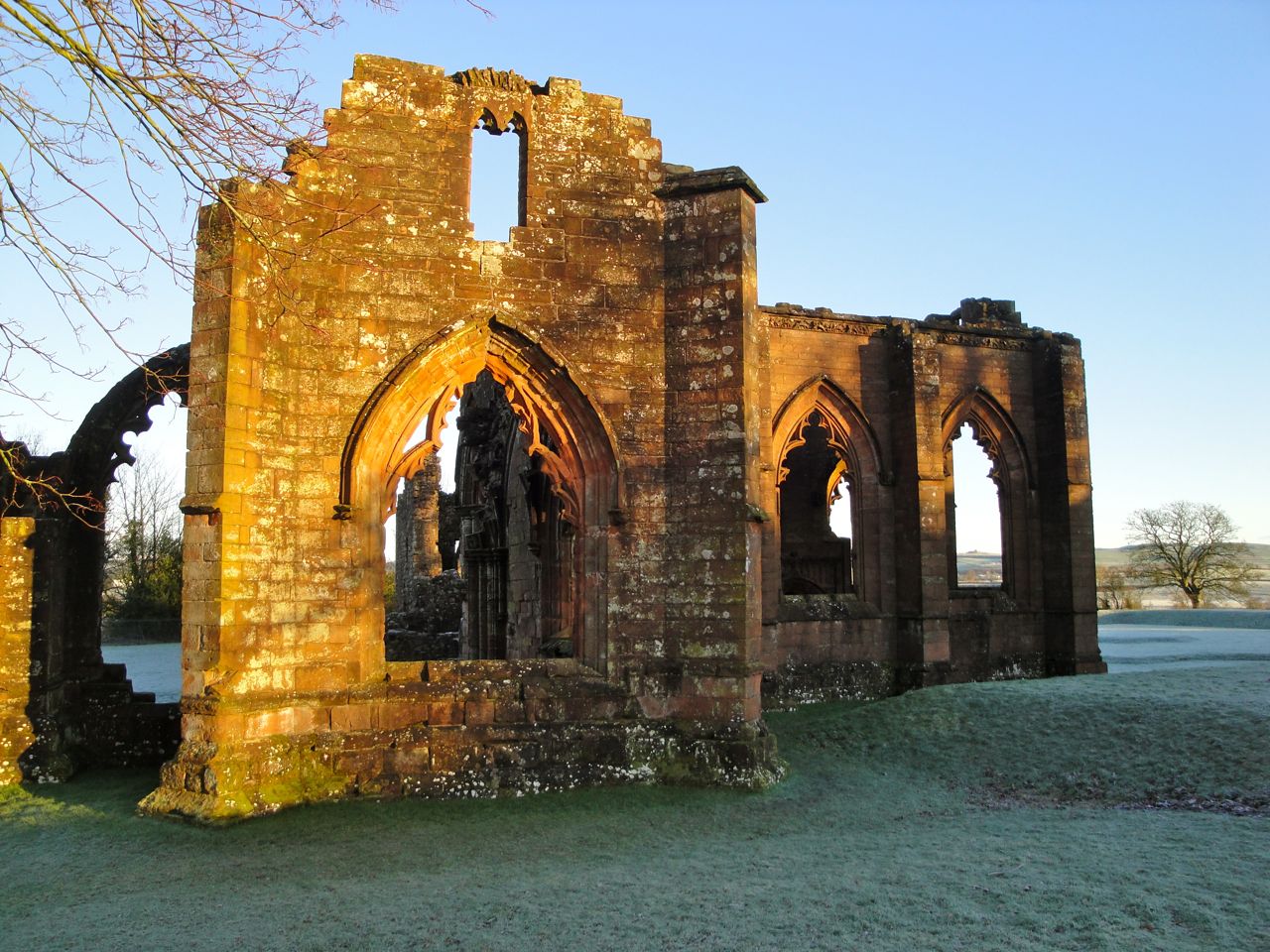 Lincluden Abbey is soon visible, standing close to the meeting of Cluden Water and the River Nith. There is a motte next to the abbey which would once perhaps have held a fortification but now has a grove of trees. The climb up was a little steep what with the slippy leaves. There is a gentler route up from the far side of the gardens but I only saw this once I’d slipped my way up the direct route. The best views of the ruins are from the mound but my mistake had been to set off too early, so the sun was still a little low for good photos. Another place for the revisit list.