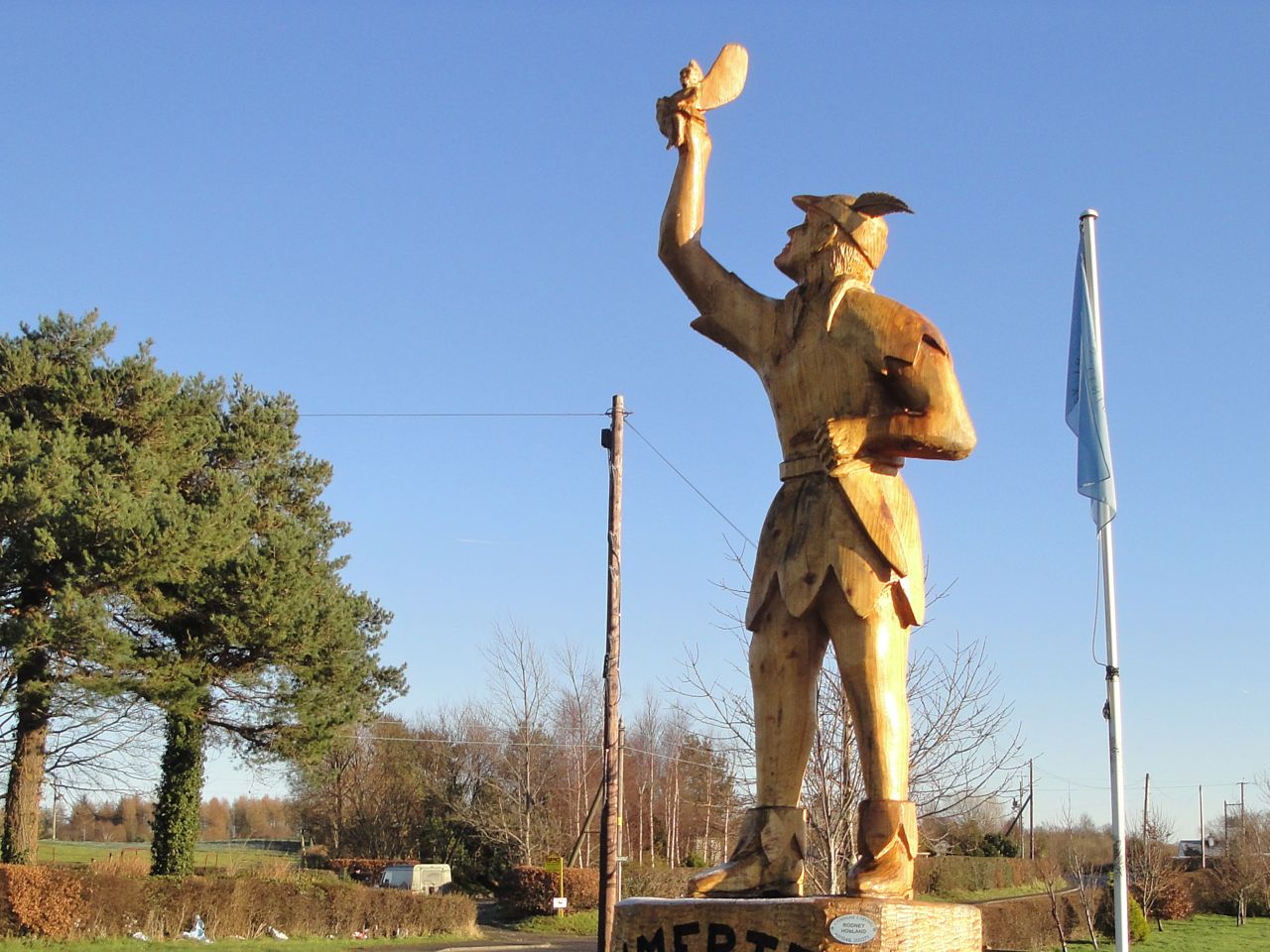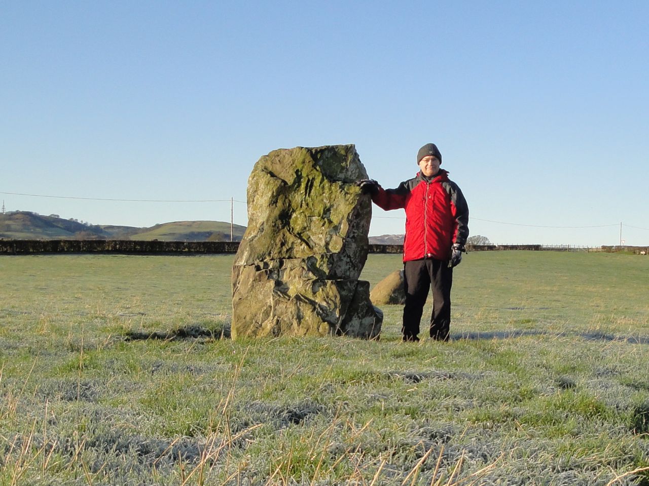 I then turned left and headed up to the field containing the Twelve Apostles. This is the largest stone circle in Scotland with a diameter of 89 m. There are eleven stones, but prior to 1837 there had been twelve. Local folklore says Judas has been removed. Historians think there were originally eighteen stones. Early writings, from the medieval period, refer to this as the Druid’s Temple, and a nearby village was even named Druidsville, but the Stone circle dates from 1500-3000 BCE, so it predates the Druids by a millenium. From the Druid’s Temple I followed the road to Holywood village where a couple of Christmas trees stood before the Church Hall. The holy wood has long since gone but was a forest of oak stretching for 6 miles north of here. This iteration of Holywood village is relatively new having developed after WW2; the original village (Druidville) had been a mile or so north, where the petrol station is now.