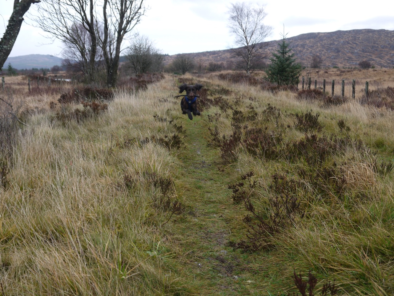 When last i was here this section of the track was overgrown enough to make walking quite difficult. Now as you can see in the photograph below, the walking is easy, even for a wee dog with a stick.