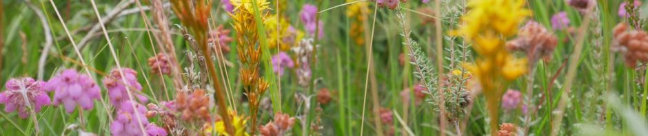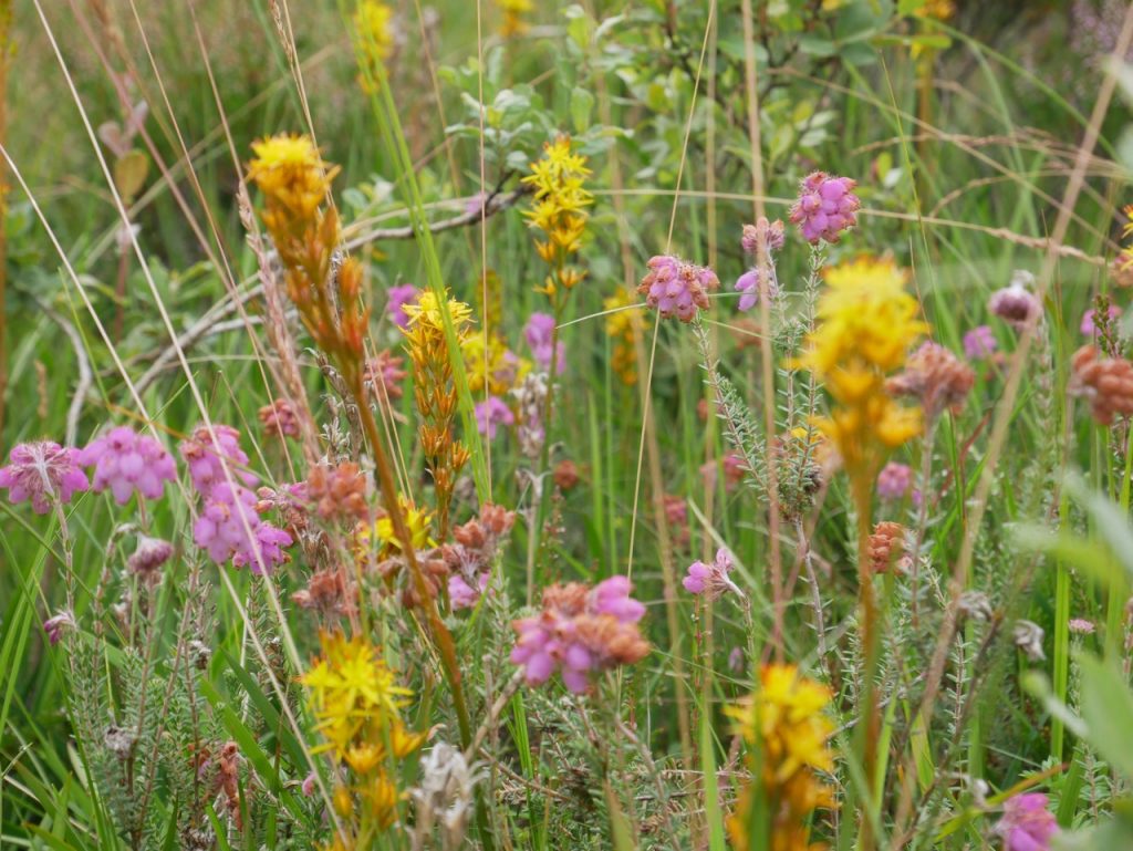 There were burnt trees and charred fence-posts beside the path. The fire was in April three months earlier but already there is new growth covering the black bare ground. In places the underlying peat has been uncovered and has been eroded by rainfall. I had thought the growth looked a season or two old but nature is obviously quicker than I thought. Hopefully the ground will quickly be stabilised and protected. There is a different flora here. Yellow cats-ear lined the track with occasional hawkweed and a real dandelion here and there, heather, wood sage, knapweed, yarrow, bog asphodel, and fruiting mosses on rocks. And a large stand of tufted vetch among the ruins of the railway halt.