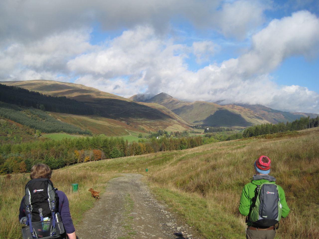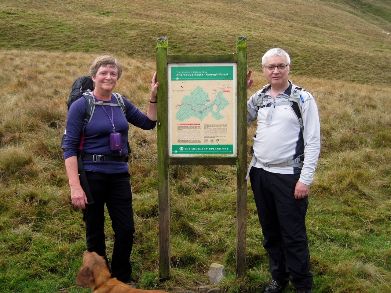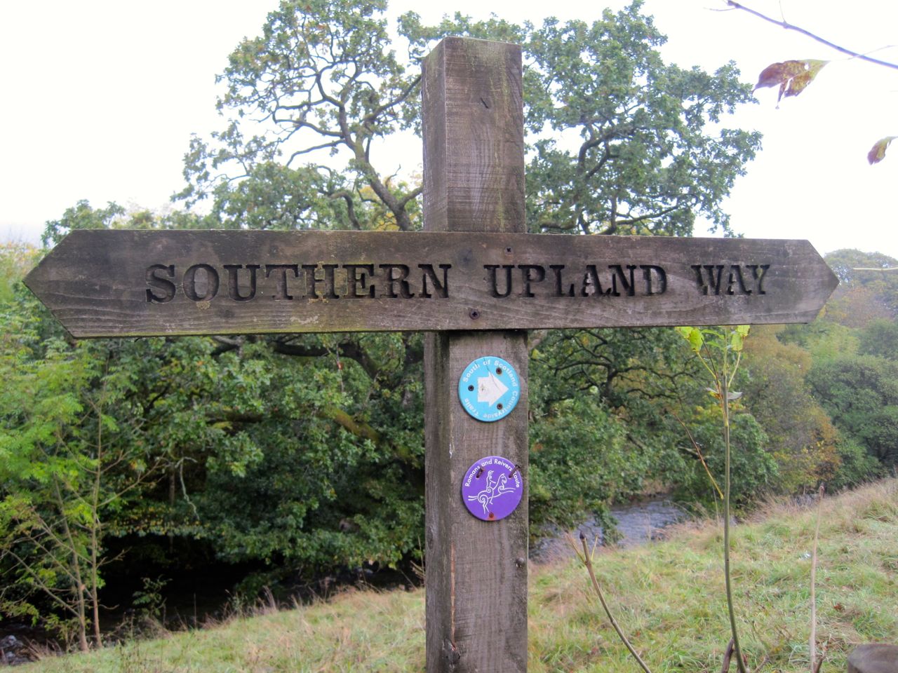 Audrey, Conor, myself and Eddie (the pup on his first 4+ mile walk) set off from the A708 near Craigbeck, along a minor road and joined the SUW after crossing the bridge over Moffat Water. An SUW sign here also sports a Romans and Reivers marker so hopefully that route will have way markers when we come to do it. I took out the camera to get a photo….and it wouldn’t turn on.  I had forgotten to put the battery in it. Luckily the back-up camera was charged and looking on the bright side, I could carry the point and shoot in my pocket rather than having the heavier camera round my neck.