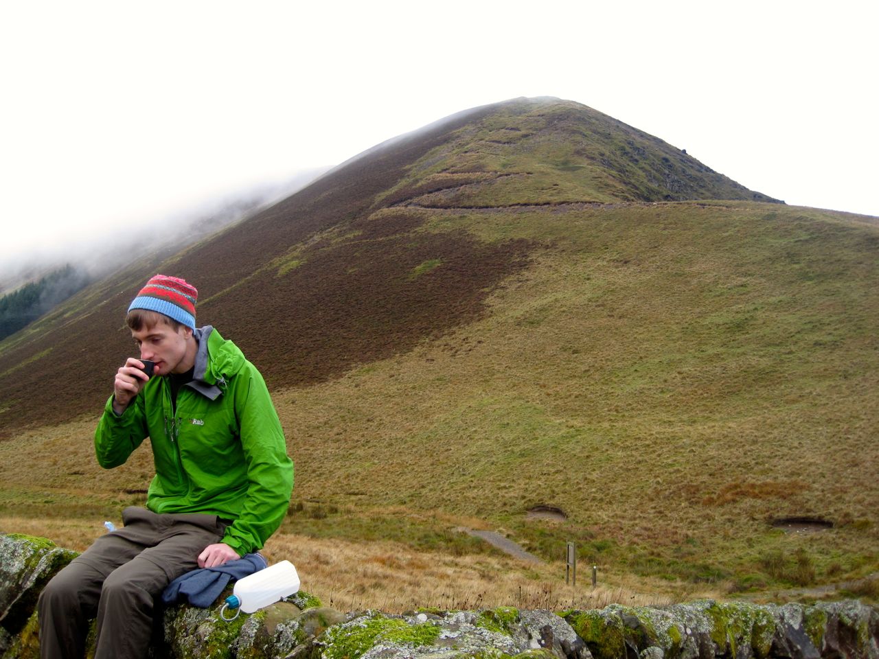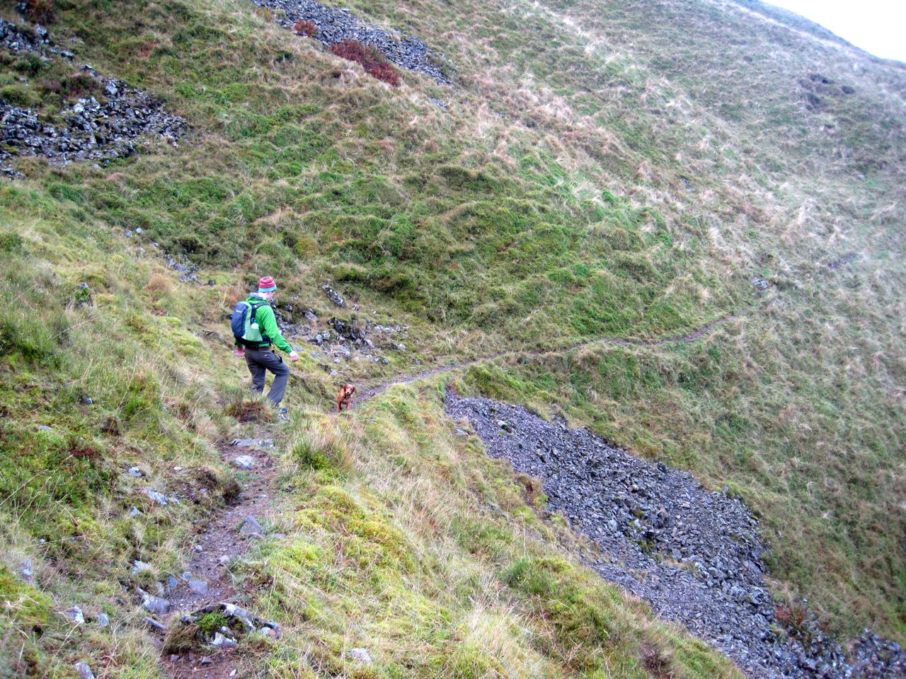 The end of the SUW it may have been, but not the end of this walk. We had a late elevenses/early lunch in the sheep fold below the zig zag path of Cat Shoulder. It was not raining but the stones of the sheepfold suggest that wet is their usual state. The moss growing on them looked like seaweed.