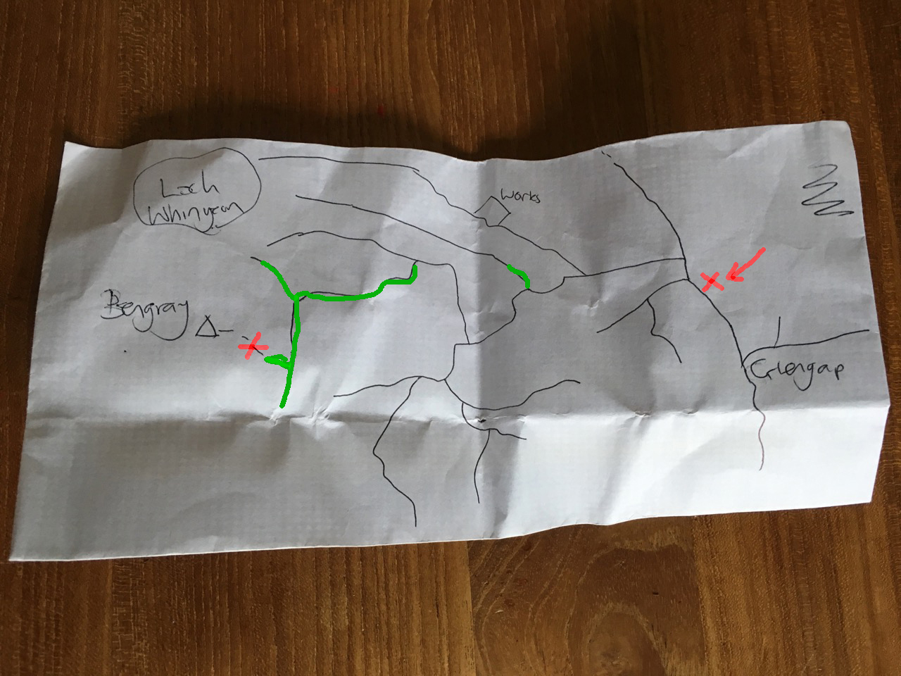 Another wee forest walk, this time in Glengap forest which takes its name from dock leaves. I had drawn out a simplified route on the back of an envelope, using the OS 25k as my source. We started at the X (on the map) near Glengap and set off with the summit of Bengray as our target.