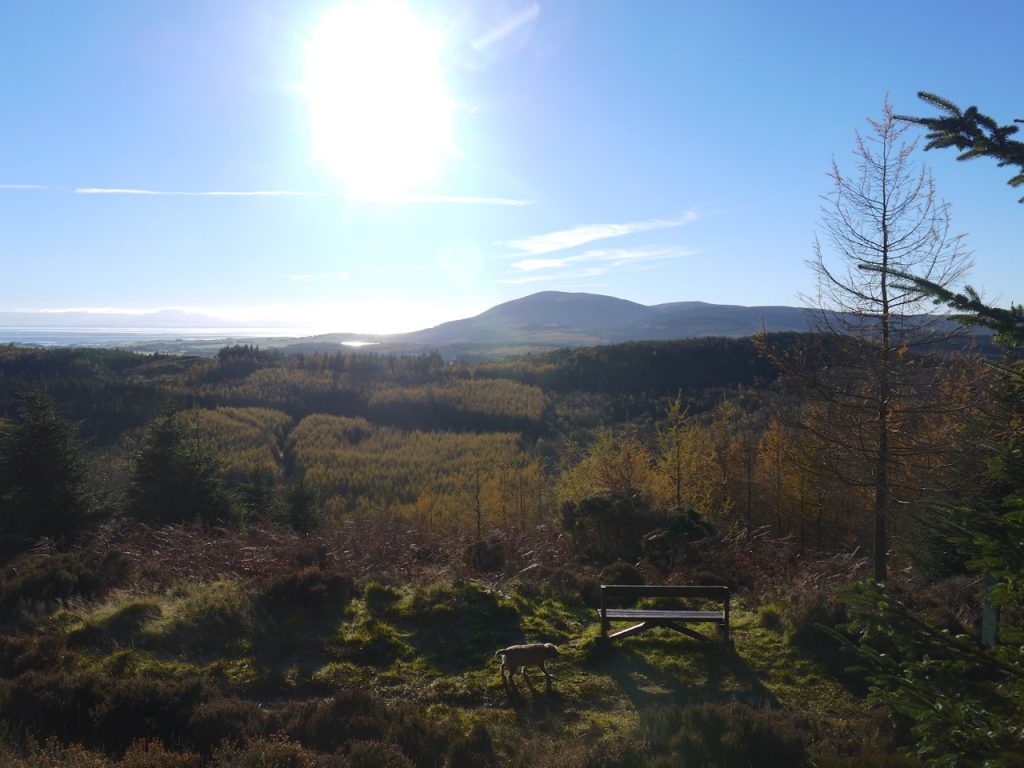There is a viewing point with a bench at about NX936738 with nice views over to Criffel and the Solway. This was actually the highest point on the track. Behind this I noticed a faint track up into the trees. Within 10m however, the trees were too dense to pass, so I returned to the path and continued on around the hill.