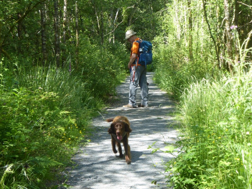 The track meandered between the trees, taking us past a moss covered knoll covered with oaks like a green-velvet pin-cushion. We would later pass a similar giant pin cushion of scots pine. There was a sturdy wall to cross before we came alongside the river again. Steps in it, and a handy pole for steadiness would make climbing it easy – but not so with dogs. Luckily there was a way around the end of the wall, though the path there is badly eroded and looks as if it won’t be there for long.