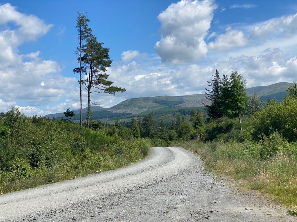 The transition between the SUW alongside the Minnoch and that alongside the Cree was not at all as I remembered it. But it had been in the opposite direction. The SUW joins a forestry road for 0.5 km and we had some breeze to keep the insects away, but yet again any places to sit were in the boggy ground either side of the track. I was wary of stopping on the track in case a car came along, though when we reached the end of the track we found a locked gate that would have kept vehicles out.