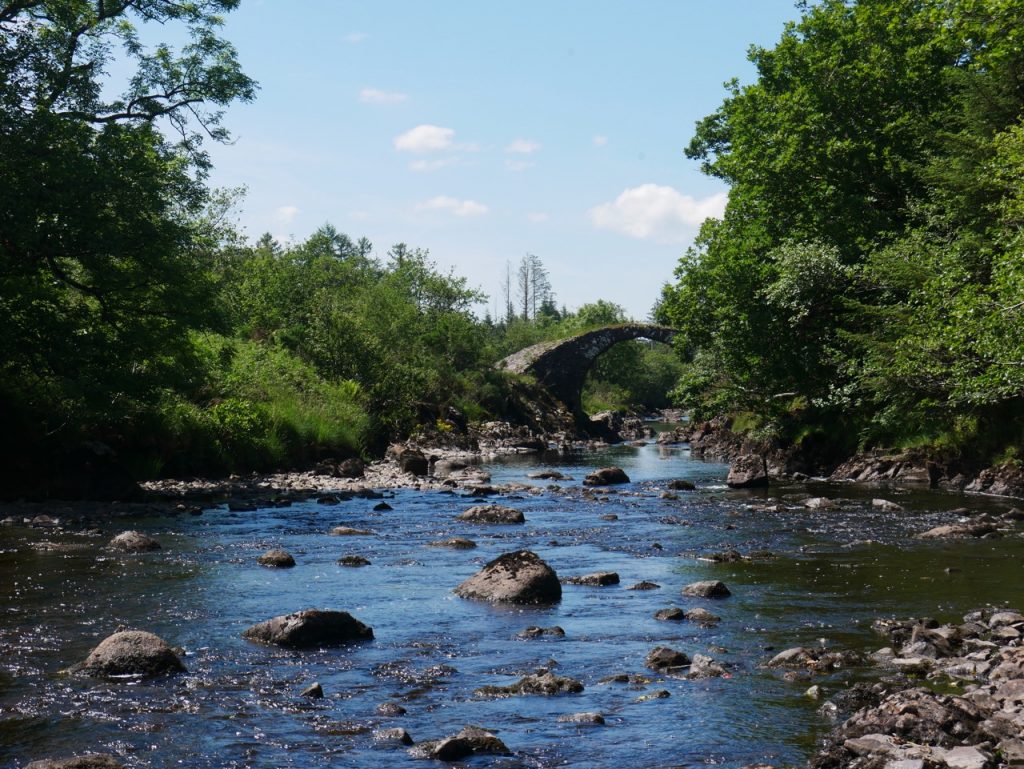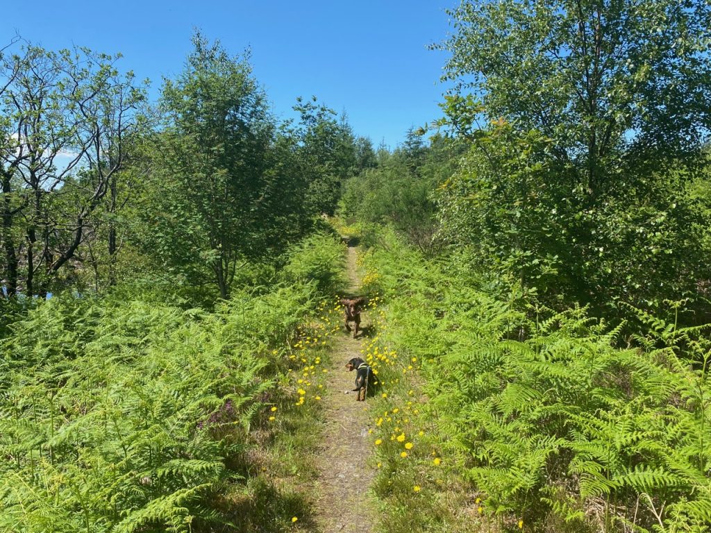 Beside the river the path is lined with cat’s ear and dandelion, and surrounded by dense growths of bracken. I spied the old bridge up ahead and we made our way down to the river so the humans could have a better view and the dogs a cooling paddle. The SUW swings away from the river about 200m before the bridge, but I decided to see if we could get closer. We followed a faint track through the bracken alongside the river and came to the bridge itself.