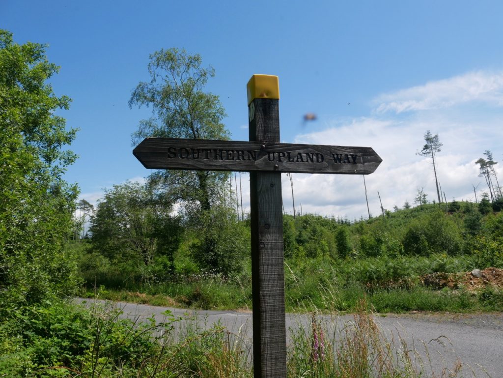 And indeed, we came to the bridge over the Water of Minnoch that carries the SUW to Dalane. That was somewhat annoying since we were supposed to turn right onto the SUW before we reached the bridge. We had seen no path. I rechecked the map, then rechecked the woodland beside us and there, almost hidden in the greenery, was an SUW waymarker post. And beyond it a faint path into the forest. The forest floor here was carpeted with the cow-wheat, cáraid bhuidhe, the yellow twins, much more striking in real life than on photos. The human eye must differentiate the yellow from green better than my cameras’ sensors. I wonder that I have never noticed cow-wheat before.