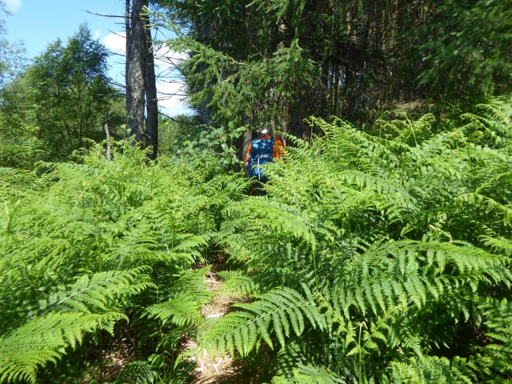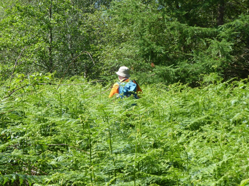 From there we had three faint paths to choose from: back the way we had come (overgrown), or two that might take us back to the SUW without retracing our steps. We chose the middle one but it petered out within 30m. So back to the bridge and onwards. No path was evident since it was hidden beneath the bracken. But Mabel, her eyes at the level of my ankles, could see the way and led us along.