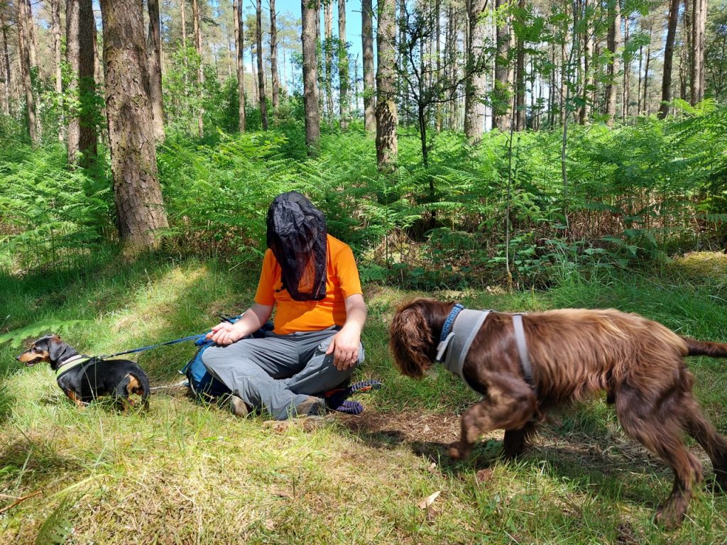 Phew! It was too hot for hill walking, but escaping sunstroke would mean braving meanbh-chuileag and their buzzing buddies. Midge bites won over sunstroke. Sphagnum, purple moor grass and soft rush are the midges favoured breeding grounds. We passed plenty of each and when we strayed away from such places, other flies circled us, dogs included, like the orbiting insects seen around cartoon characters. But we came partially equipped, me with my midge net, Audrey with her midge repellent spray.