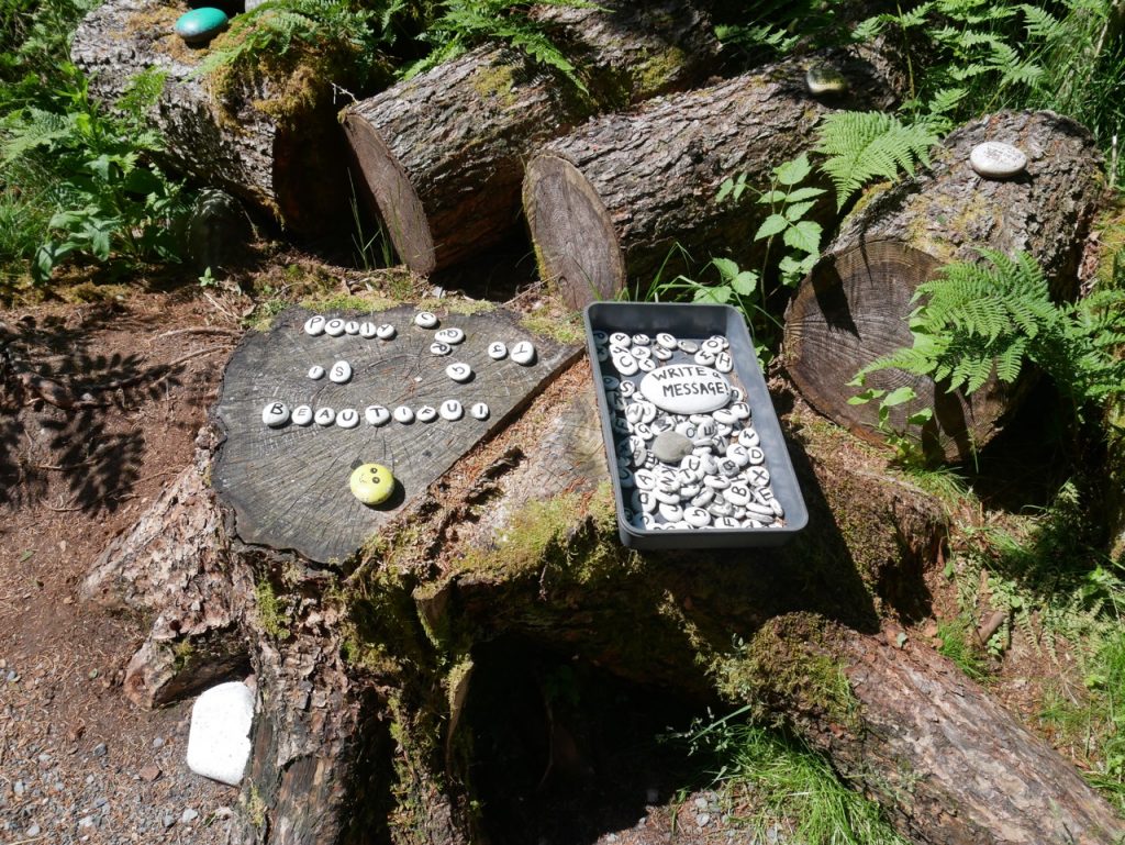 There is a new footpath between Bargrennan and Glentrool village, so we only had a short section of road walking. The Bargrennan path is lined with painted stones and motivational phrases. So as well as stones painted as butterflies or ladybirds, there are stones advising you to smile, telling you you are great or allowing you to spell out messages. The Flintstones and the Seven Dwarves are there, and many smiley faces. The trees cast shadows but just the right amount of sunshine reaches the path.