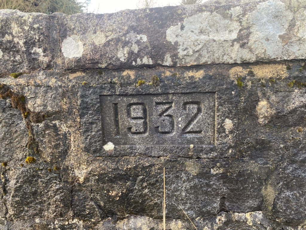The JCB driver reversed a little so we could squeeze past with having to swim the flooded ditch or sink in the newly dug mud and we came to the small bridge over the Pulran Burn, noting that the parking space was full. But failing the notice the track behind the cars. Instead I was looking at the loch, the burn and the bridge, with its inscribed “1932”. Pulran, pol rathain, means stream of the ferny place but perhaps that describes somewhere else in place or time.