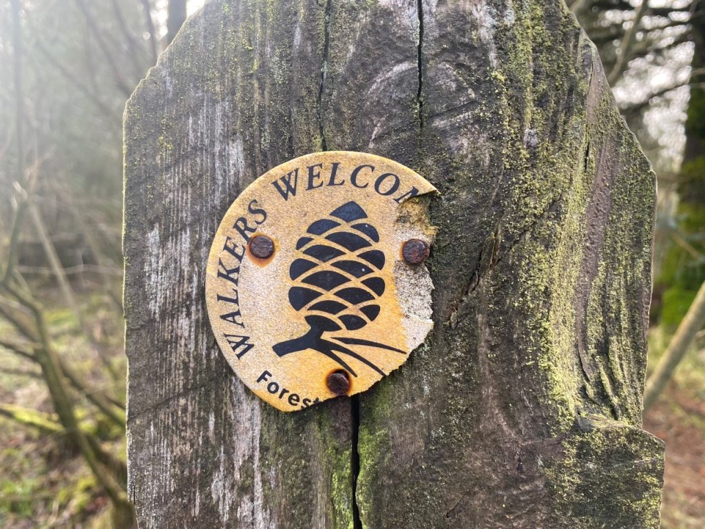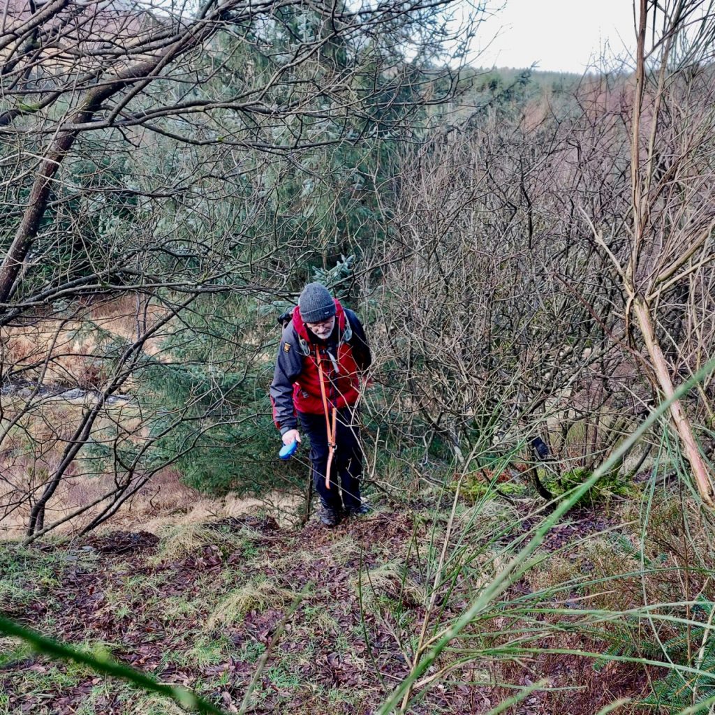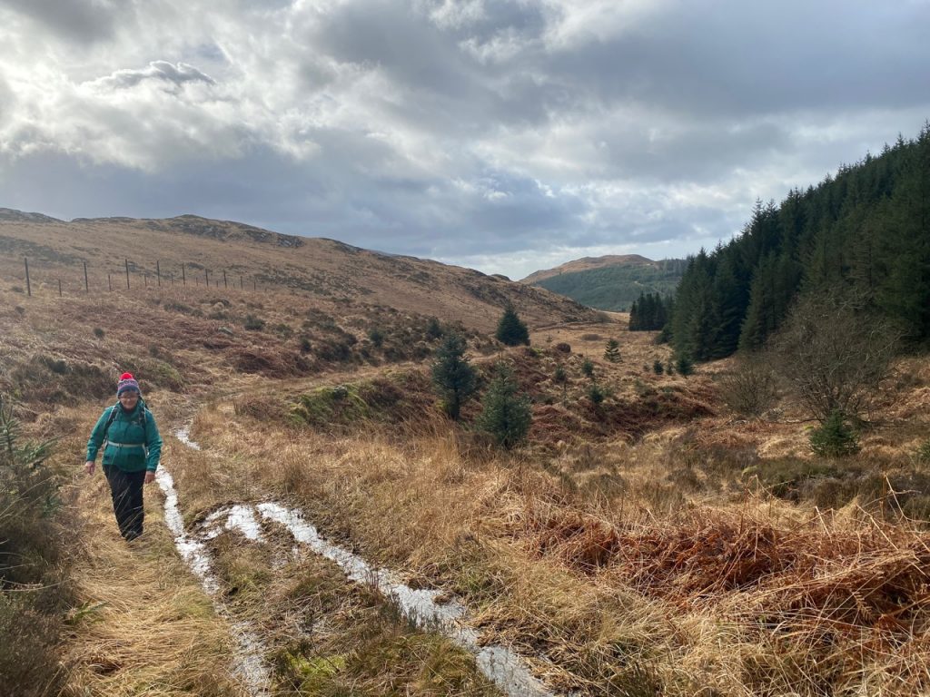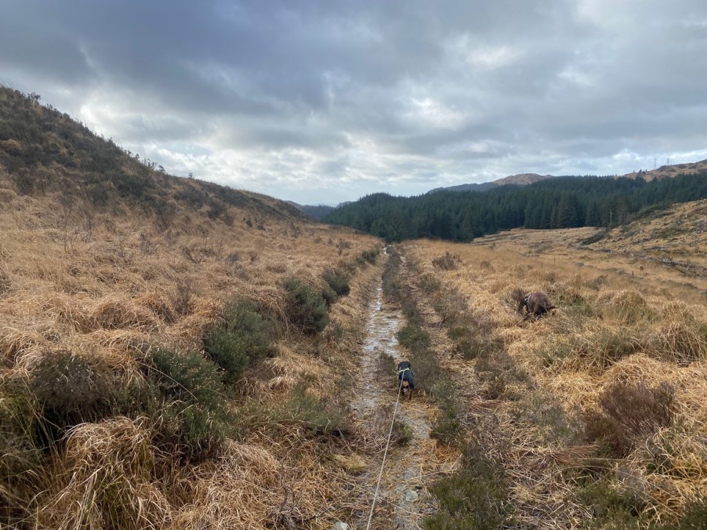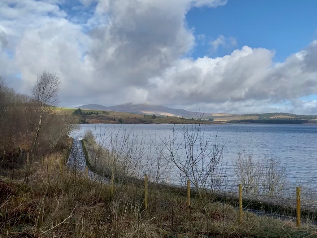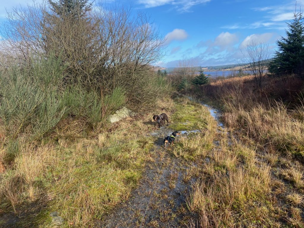 To every choice there is a purpose. But such purposes can slip one’s mind. We had paused our planned walks along the Eden Way for the winter, choosing instead to walk on firm ground such as forestry tracks. This section of the Old Edinburgh Road, between Clatteringshaws and Black Loch, has the OS map symbol for “other road track or path, unfenced” and though much of it is freshly surfaced forestry track suitable for heavy vehicles, the first 200m from the loch is unmaintained overgrown and in places waterlogged, while the track beyond an old quarry below Brockloch Hill is trying to pass itself off as a waterway. Had I remembered the purpose of choosing Forestry tracks for our Winter walks I might not have ventured onto the wilder sections until the winter wetness had passed.