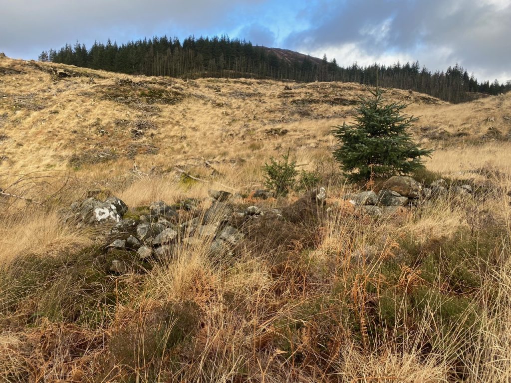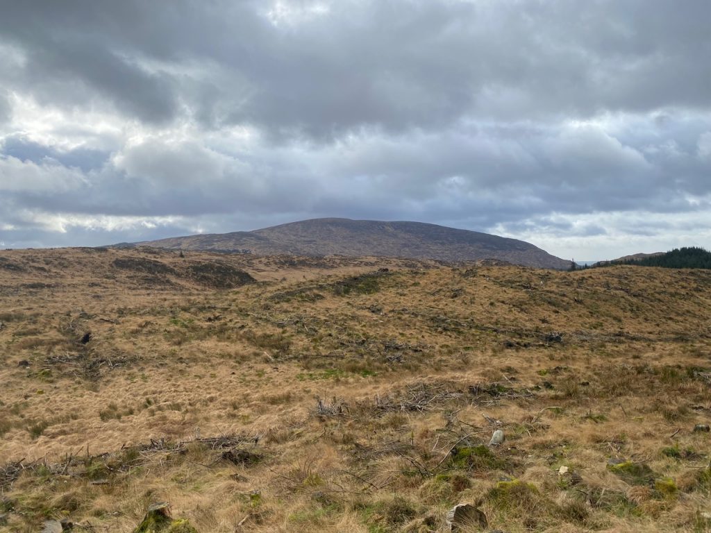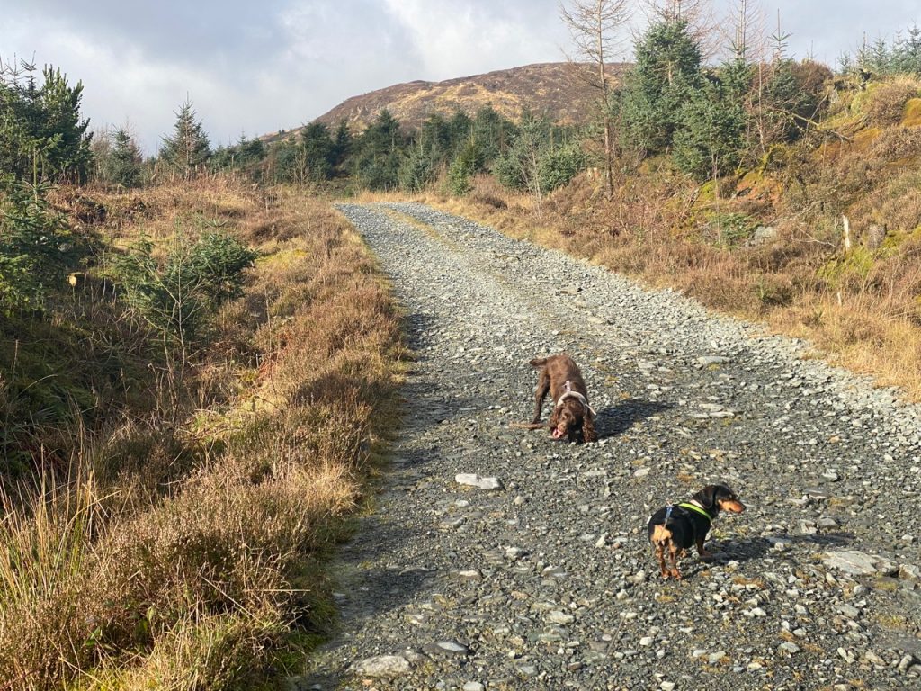 Having squelched back up the saturated track we stepped back onto the well drained forestry track and decided to see where that track went. We could see it went further than is marked on the map. It looks to have been recently built, presumably for felling the forest on Tonderghie Hill. It winds through what was once forest but is now reverting to moorland. It looks to have earned its wilderness badge.