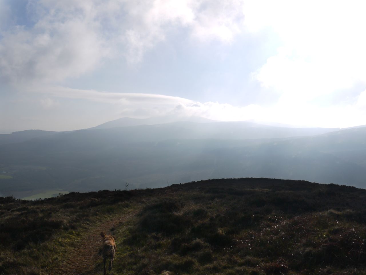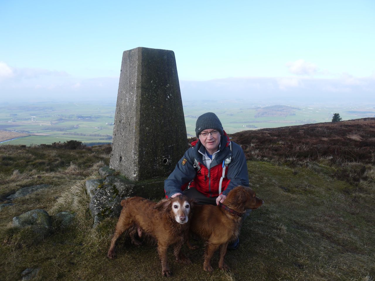 Well, across the moorland and on to the summit, where stood another walker with a spaniel (volume set at 11). Eddie was hackles up, Sweep unperturbed. The walker and his spaniel, peace disturbed left the summit to us and we had nice views from the top, Criffel’s summit hidden in cloud, Waterloo Monument below it. Stopping was not to Sweep’s liking however and he barked and barked and barked until we got going again.