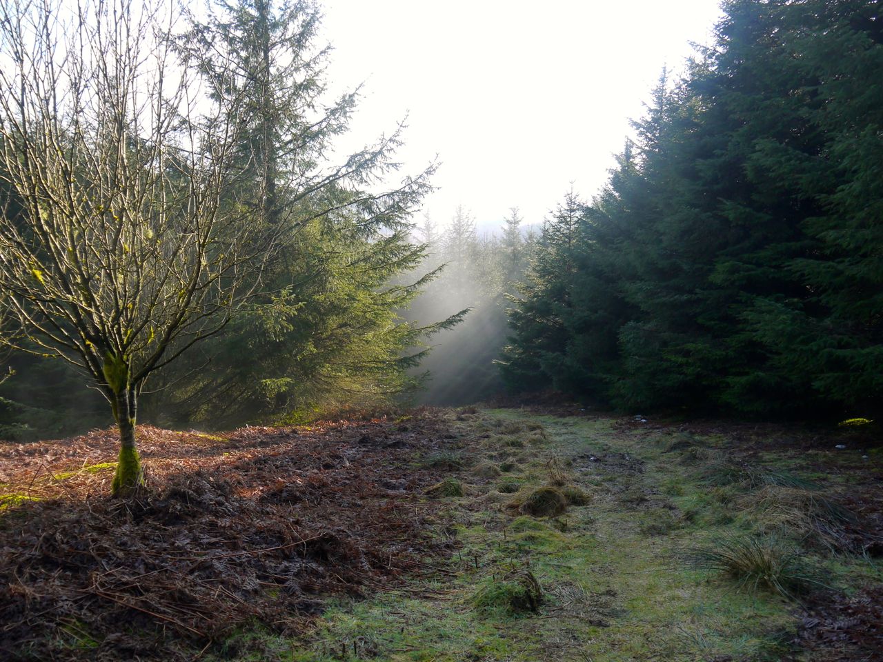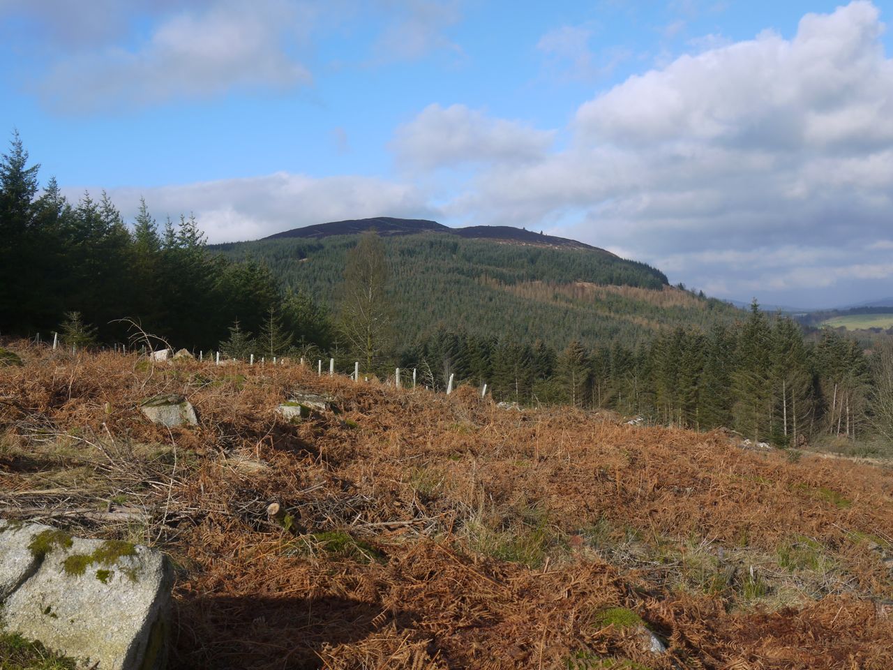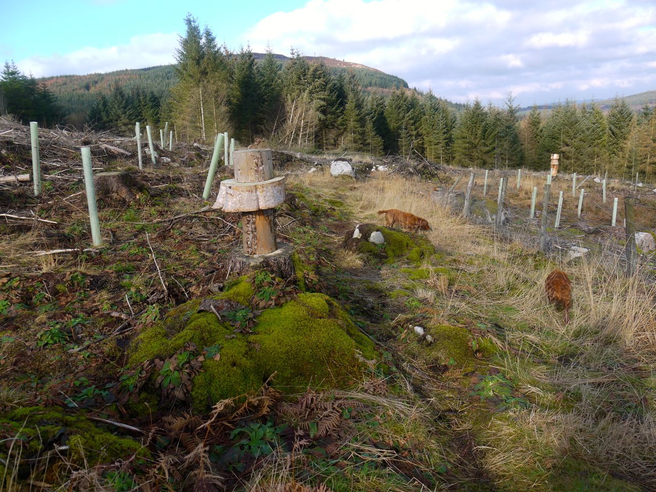 Forestry tracks, paths (stony, mossy, boggy), pine-needle covered forest walks, heathery moorland, fallen trees, felled trees, distant gunshots, rocky outcrops, erratics, collapsed dykes, burns, bridged and unbridged, forest (conifer, deciduous, felled and replanted), ad hoc wooden sculptures, with views of sea, lochs, hills, dales, and monument to 19th century victory.