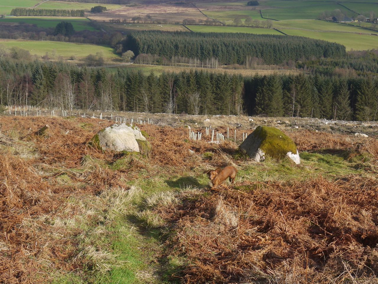 We headed down the southern slope of the hill, along the obvious track and used the stones of the collapsed dyke as seats for our coffee break. For reasons that escape me, Sweep tried to climb onto the wall, which wasn’t a good idea with his arthritis. When denied that option he took to rooting in holes, but the rabbits must have been beyond his reach.