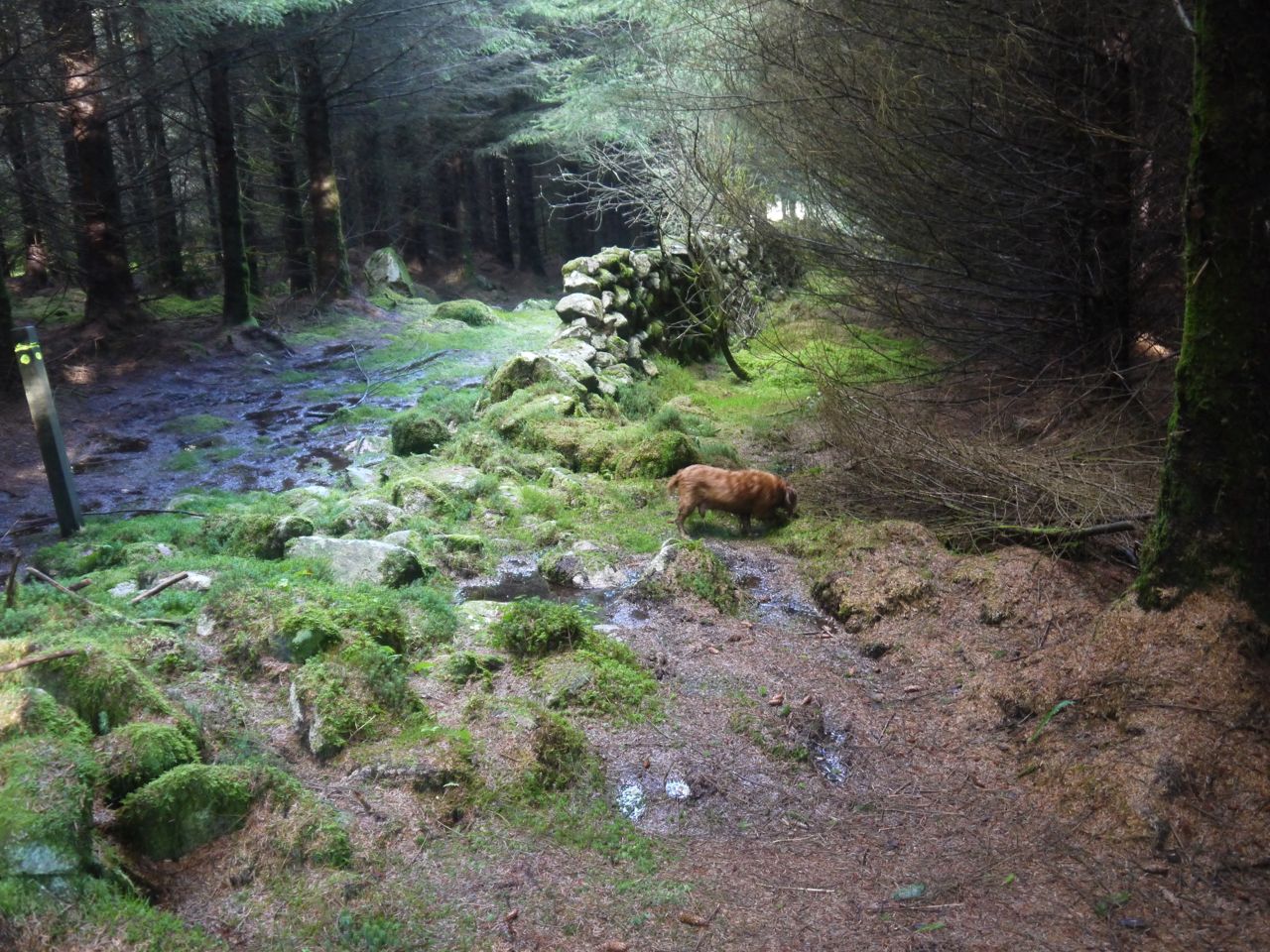 Post coffee, onward. Down to the forest again and along a wide forest break carpeted with the friable moss. The dogs running ahead gave us some warning as to how deep one might sink into this. The gap between the trees then lessened and we walked around several large erratics that would be good seats for lunch. We passed the well walked waymarked path leading back down to the forest track and continued on the other waymarked forest break, but now without any discernible path. A word of warning here. If you are expecting to take the shorter route beware that a path seems to go off about 50m before the real route. I’ve used that by mistake before and it goes nowhere.