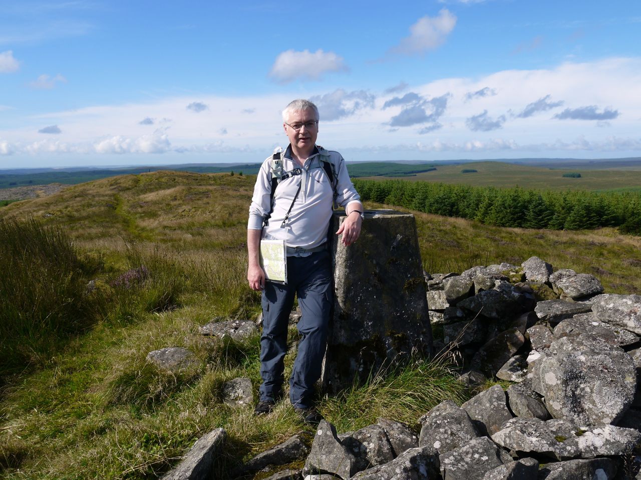 Craig Airie Fell is the highest point in the old county of Wigtonshire, its name derived from airidh, a hill pasture. It has excellent views, mostly over moorland scattered with small lochs and the Galloway Hills as a backdrop. The trig pillar has a low stone shelter about it, and though it does not offer much shelter, it works well for seating, so we stopped for elevenses and to admire the view. From here the fingers of the Awful Hand Range can be clearly seen, but one’s imagination really has to be turned up to 11 to see this as a hand. Sadly the government has approved a 96 turbine wind farm on this hill and the surrounding land, so the views will likely change.