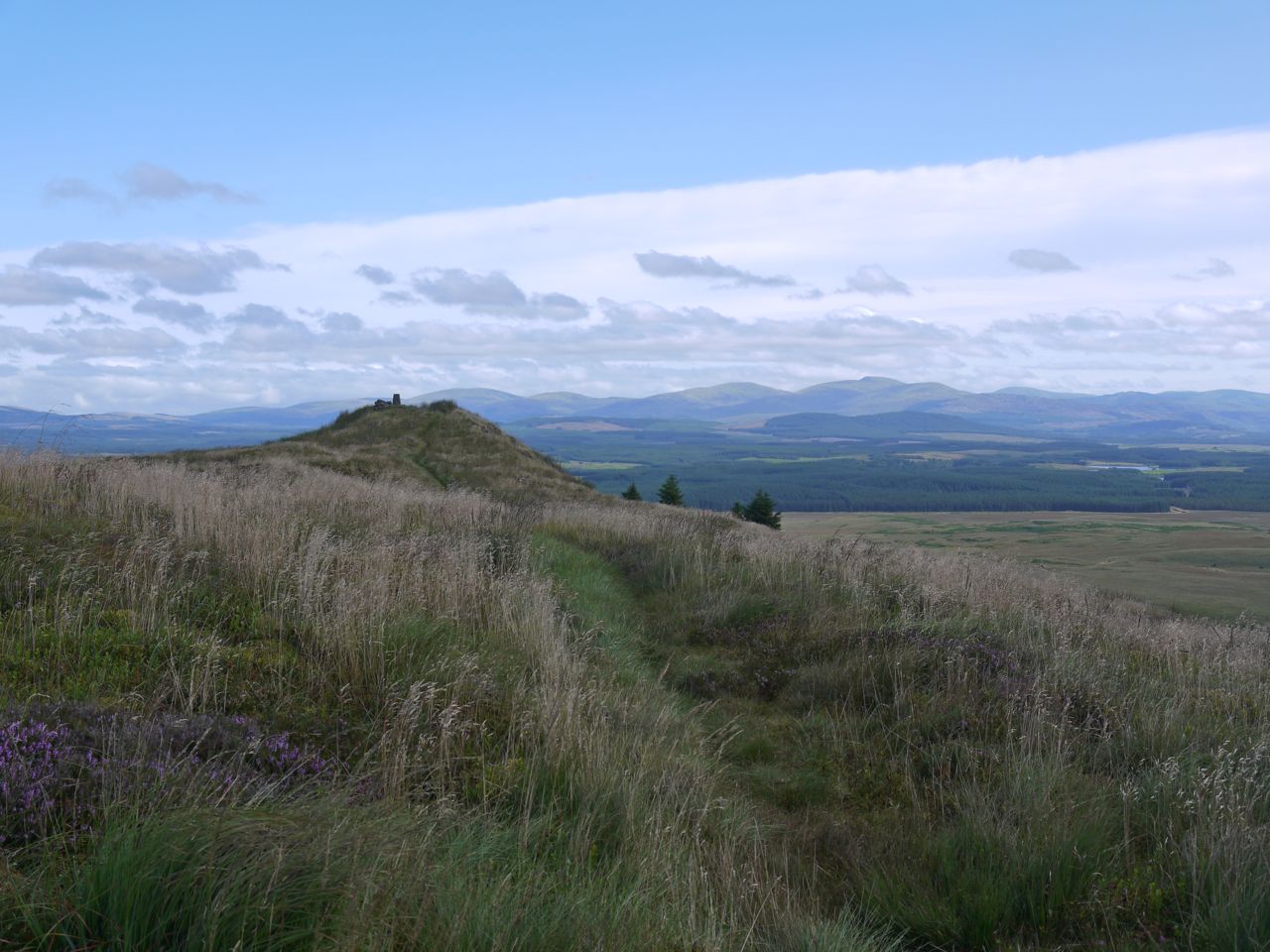 The SUW leaves the forestry track about 800m after the Linn’s Tomb sign. This is a pleasant climb along a woodland track. The plants were showing their summer colours and there were a great many butterflies about. The woodland track crosses the forestry track and then becomes a little steeper. The direction of climb allows some great views back over Loch Derry to the Galloway Hills, stretching north from the Craigenreoch group, south to the sea, Merrick standing proud of its neighbours.