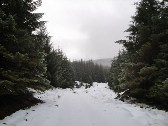 As the path climbed it gathered patches of ice, then a full covering of ice and snow. This was a warning of what was to come. The path reaches the trees at about 520m. As I walked up the hill, I was thinking, as ever, that every metre climbed was a worthwhile effort. Once the path moved into the trees, however, it descended and the snow covered path lost the vehicle tracks that had made walking easier.