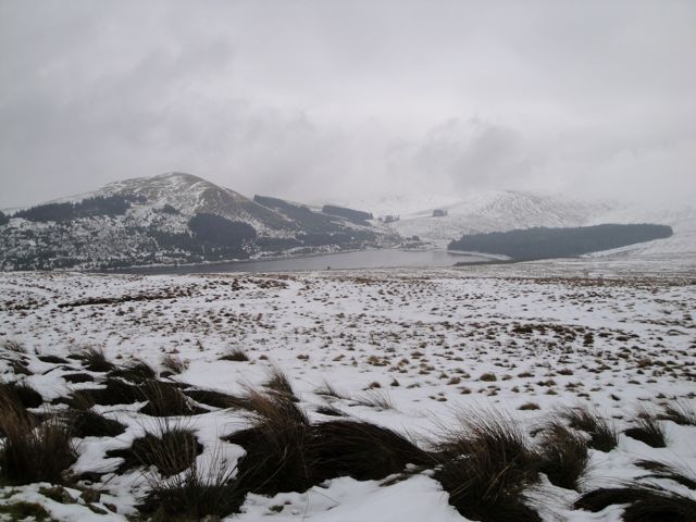 The road from New Cumnock to Afton Reservoir is one of those that starts in a reasonable condition but gradually shrinks to single track and then becomes littered with pot-holes. After the Afton Waterworks the road was covered in semi-melted and re-frozen snow and the car=park, marked on the OS map, was closed off. I managed a seven point turn in a passing place, taking care not to slip off the road and left the car at the waterworks.