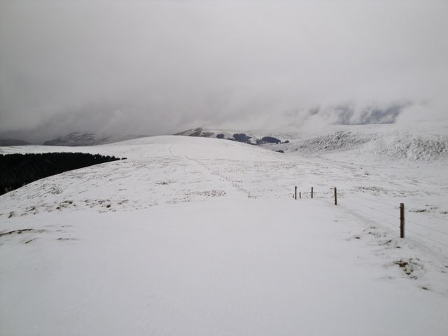 My way back over Blackgrane, Millaneoch and Wedder Hill, following the fence, was now visible and in different weather could have been an easy stroll. As it was the snow proved irritating. In places, with care, it was possible to walk on the snow but my feet would suddenly sink to calf or knee every few steps. Beyond Millaneoch the snow was softer and all steps sank, sometimes into standing water.