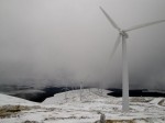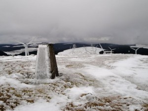 Lunch was taken next to the trig pillar and the mist lifted to allow a few photos. Moorbrock Hill and Cairnsmore of Carsphairn were now visible, beautiful in their coating of snow but Alhang and Alwhat were still lost in mist. I headed for the nearest wind turbine so I could follow its path back to the compacted road.