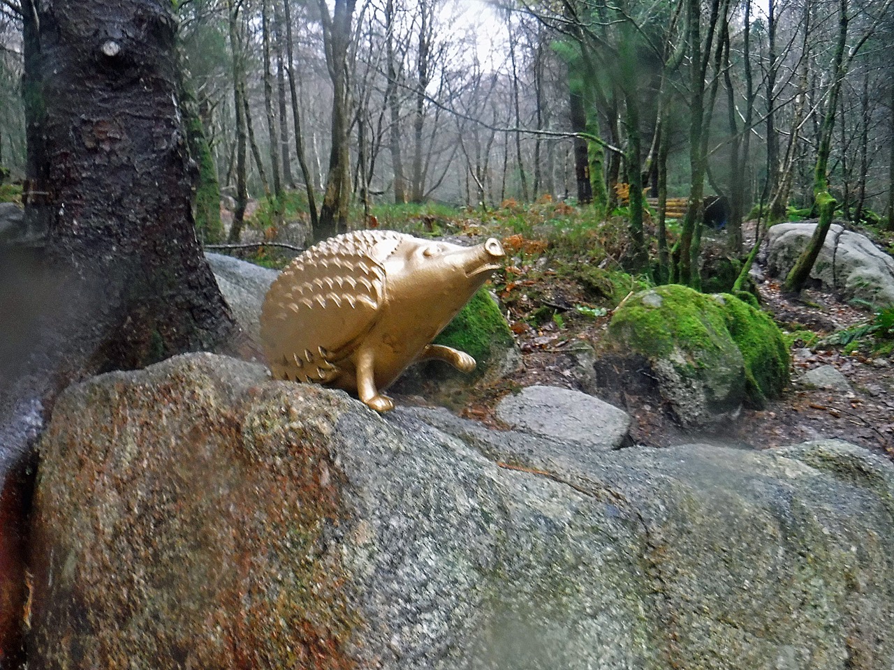 The stone lions at Craigbeck Hope watched us, unblinking, as we approached but didn’t turn to watch us walk away. Within the grounds was a pond with an island and a bridge, the water an usual green colour like pea-and-ham soup.
