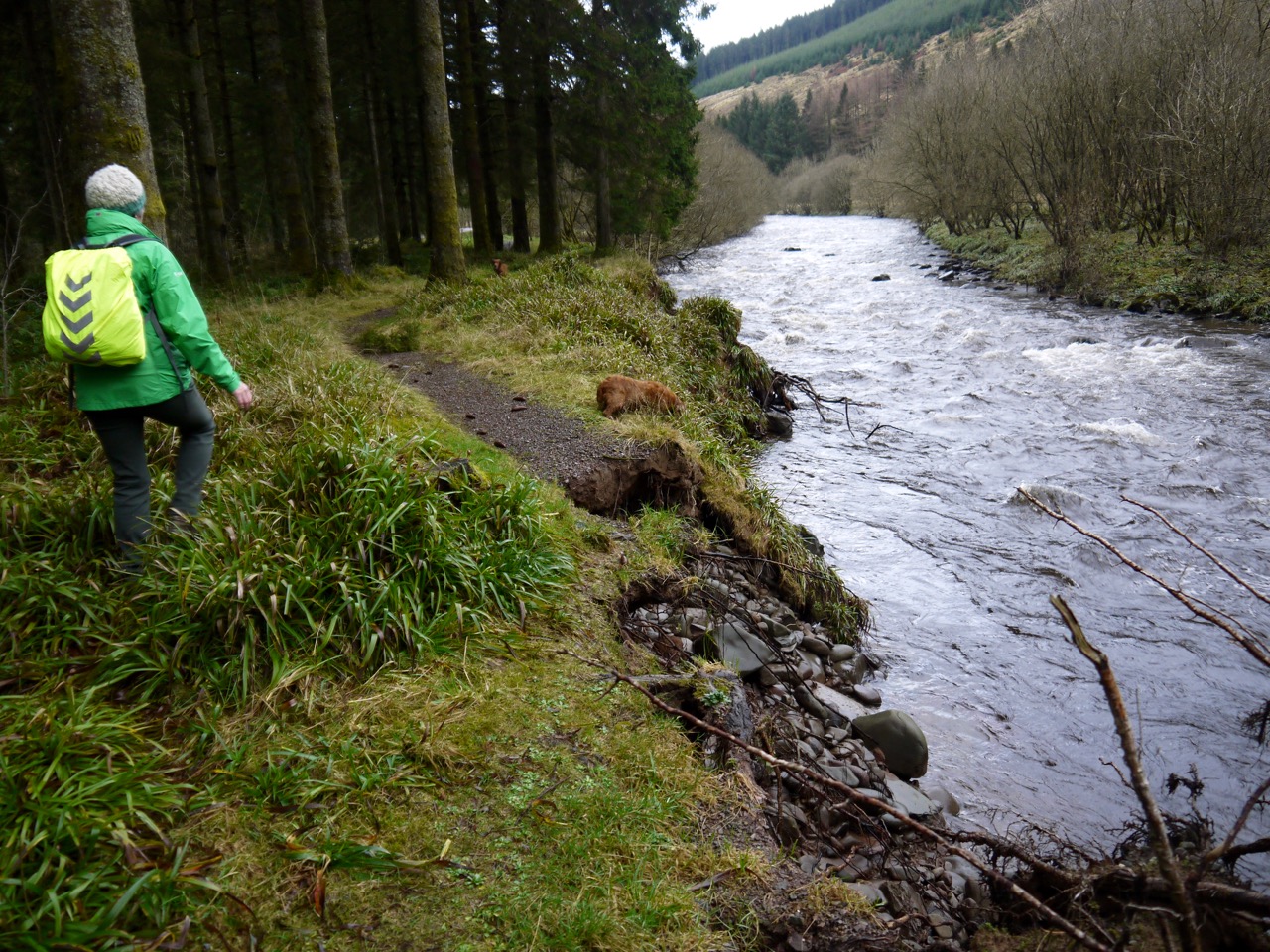 At an R&R stone, marking 7 miles to Beattock, and 8.5 miles to Eskdalemuir, the SUW and R&R part ways. The SUW follows Wamphray Water upstream in the narrow valley between Birch Hill and Knucklegill Shank, a cracking name if ever I heard one. We continued on the R&R which follows Wamphray Water downstream. This entailed quite a dogleg, walking upstream, crossing Wamphray Water and its tributary, Knuckle Gill, then heading downstream. A zip wire across the valley could have saved a deal of walking, and added some extra excitement.
