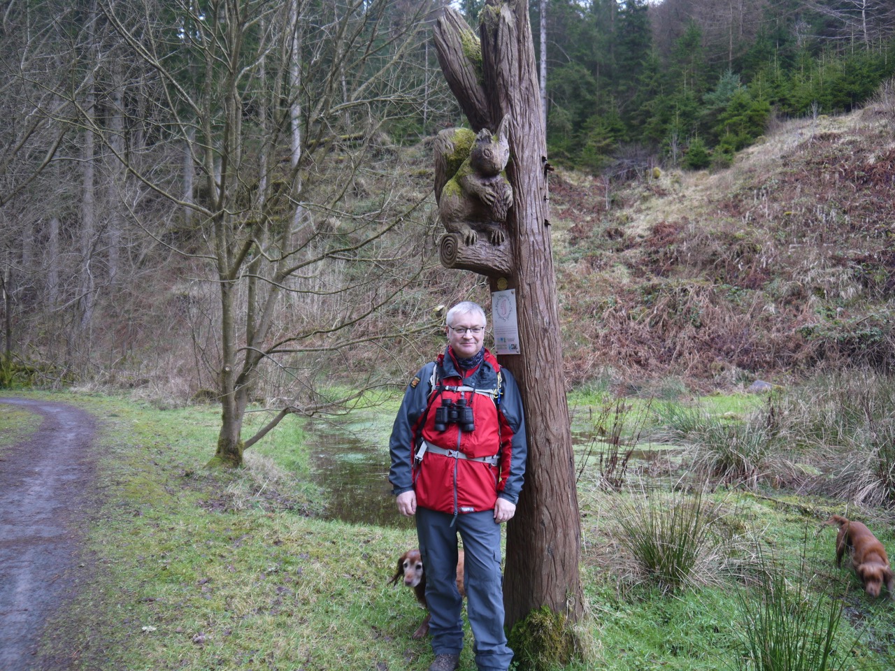 Once round the next corner we could see Ettrick Pen to the north and eastwards across Eskdale all the way to the snowy tops of Wisp Hill and its neighbours. The track passed freshly cut wood stacks with a strong scent of pine, and the machinery that had done the work. There seemed to be quite a few bare trunks left standing, many more than one usually sees. The track gradually descended down to the road beside Garwald Water at Kiddamhill. By then we were flagging a bit, well except for Eddie, who has boundless energy, but Sweep walking along with us rather than running about like the pup.